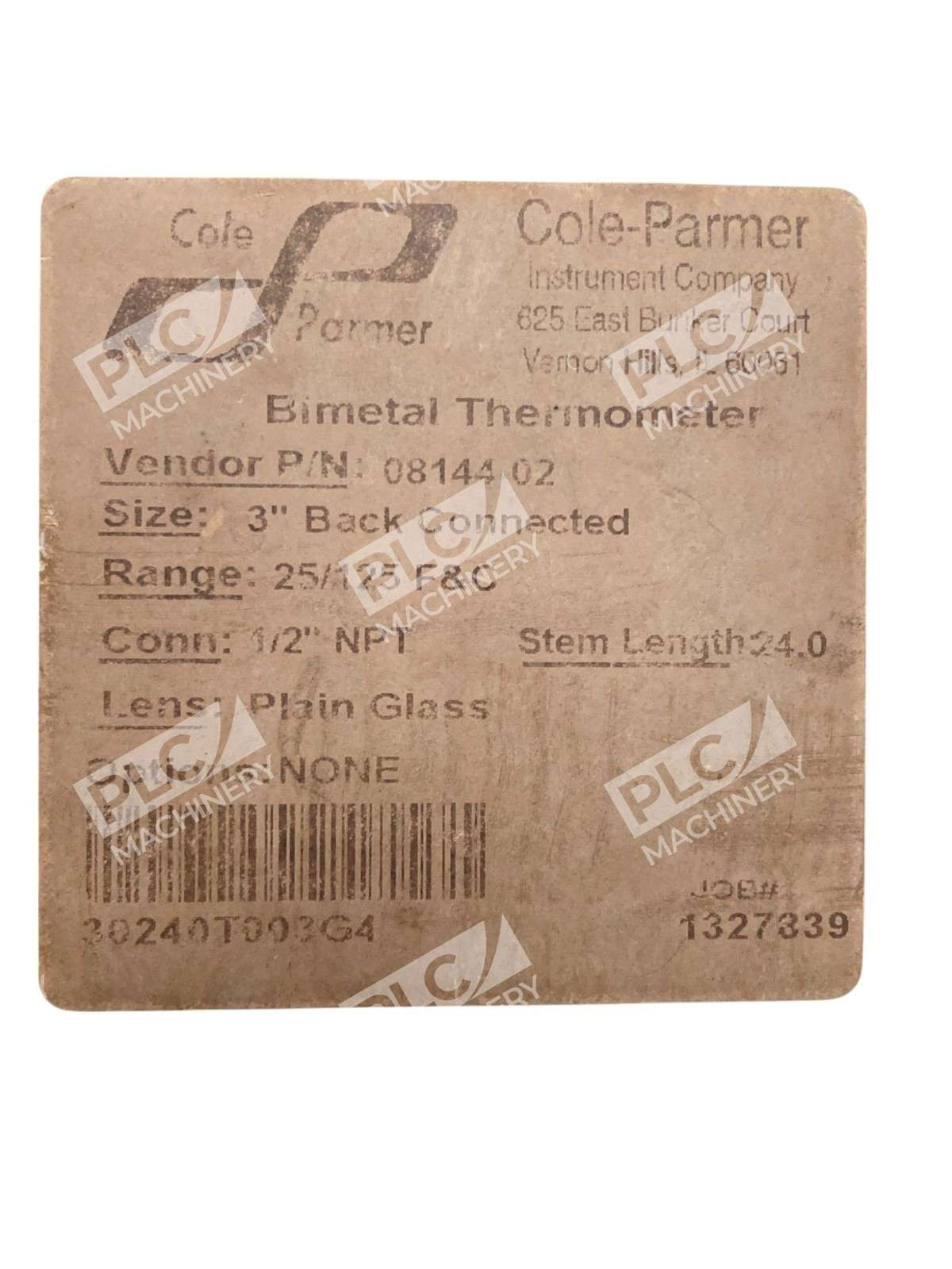 Cole-Parmer 08144-02 Bimetal Thermometer The Cole-Parmer 08144-02 Bimetal Thermometer is engineered for precise temperature measurement in demanding industrial environments. Featuring a 3-inch dial and a 24-inch stainless steel stem, this thermometer offers durability and accuracy for a variety of applications. Key Features Dual Temperature Scales: Displays both Fahrenheit (25 to 125°F) and Celsius (-5 to 50°C) for versatile readings. Anti-Parallax Dished Dial: Ensures superior readability from various angles, reducing measurement errors. Hermetically Sealed Case: Prevents moisture ingress, interior corrosion, and coil freeze-up, enhancing longevity. Rugged Construction: Built with all-welded 304 stainless steel and a clear glass lens to withstand tough industrial conditions. External Reset Screw: Allows for easy recalibration, maintaining measurement accuracy over time. High Accuracy: Provides ±1% full-scale accuracy when the stem is immersed 2 inches in liquids or 4 inches in gases. Specifications Dial Size: 3 inches Stem Length: 24 inches Stem Diameter: 0.25 inches Threaded Connection: 1/2″ NPT(M) Maximum Environmental Temperature: 500°F (148°C) for glass lens thermometers Compliance: Meets or exceeds ASME B40.3 standards Designed to deliver reliable and accurate temperature readings, the Cole-Parmer 08144-02 Bimetal Thermometer is an essential tool for professionals requiring dependable performance in industrial settings.