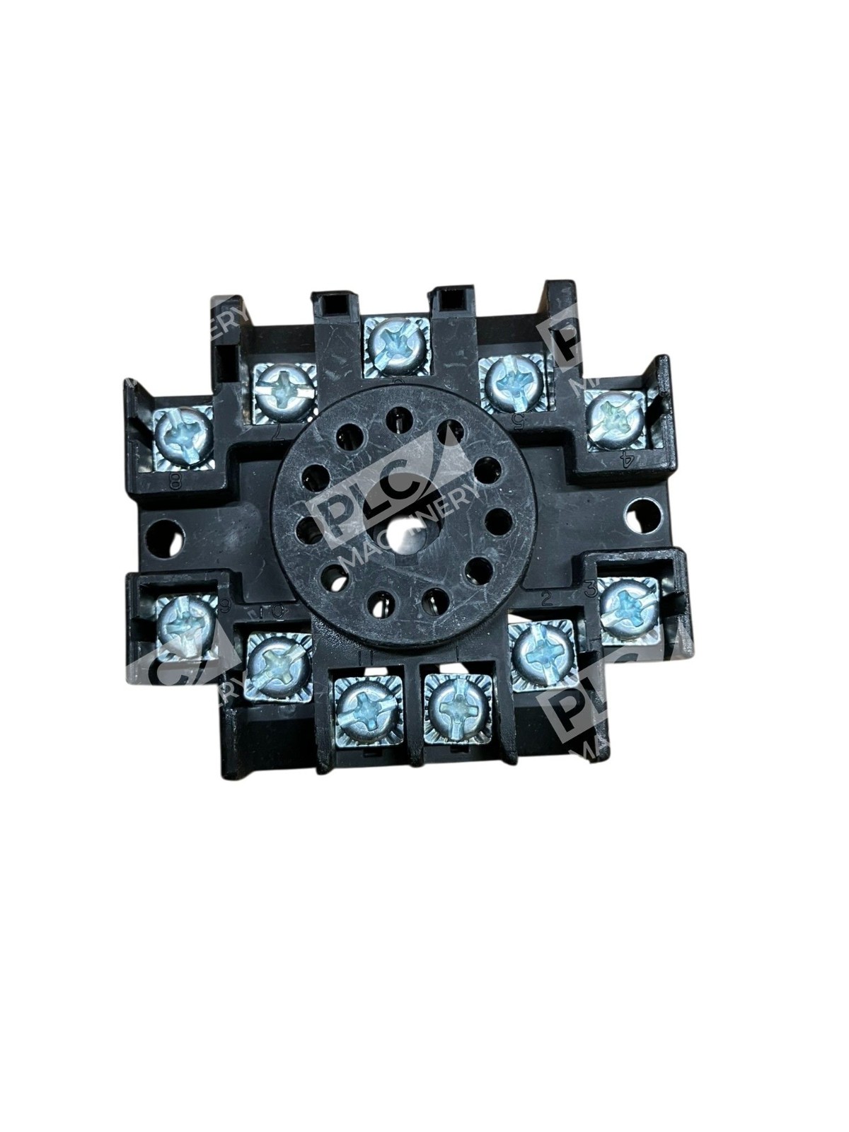 The 11-Pin Power Relay Socket Base is a black, octal screw terminal socket designed for panel mounting. It has a DIN mount and is manufactured in the United States. This unit serves as a reliable and secure base for power relays, ensuring easy installation and maintenance in electrical equipment and industrial settings. With its sturdy construction and clear color, this relay socket base is a practical and essential component for various relay applications.