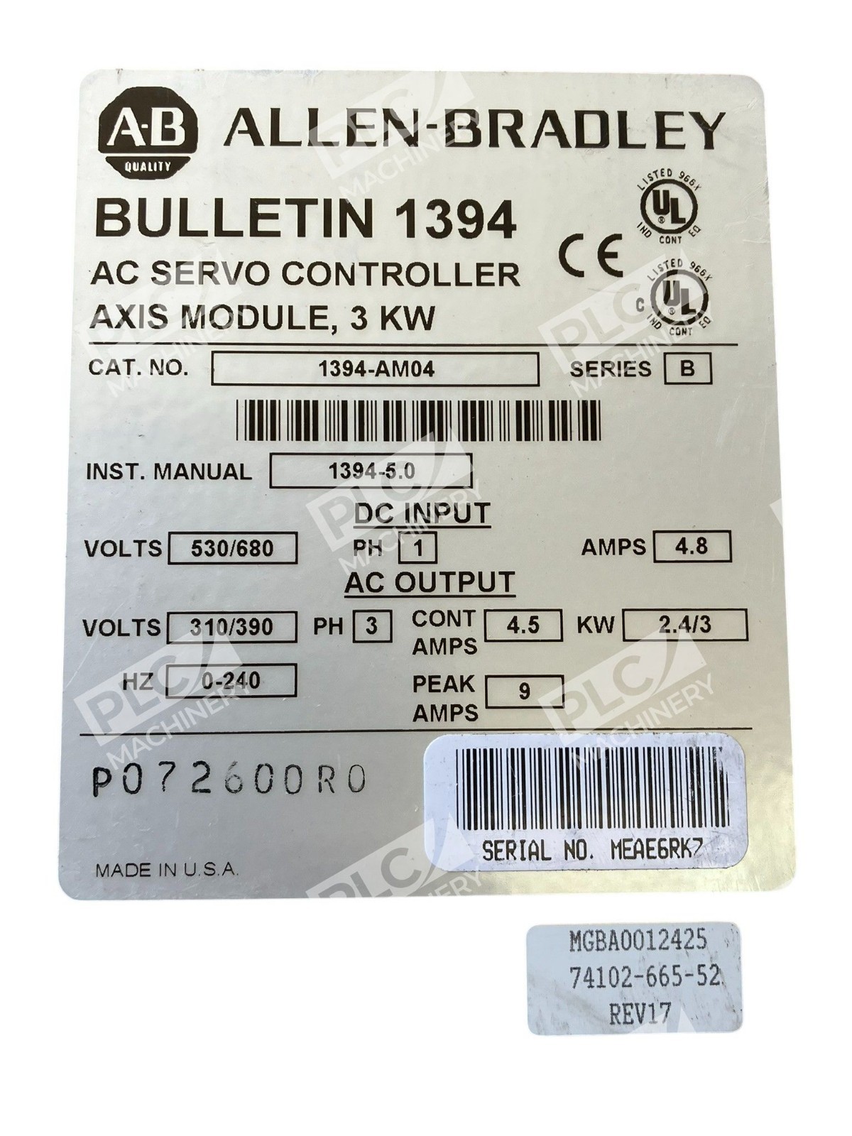 1394-AM04 Series B – Allen-Bradley – AB 3kW AC Servo Controller Axis Module