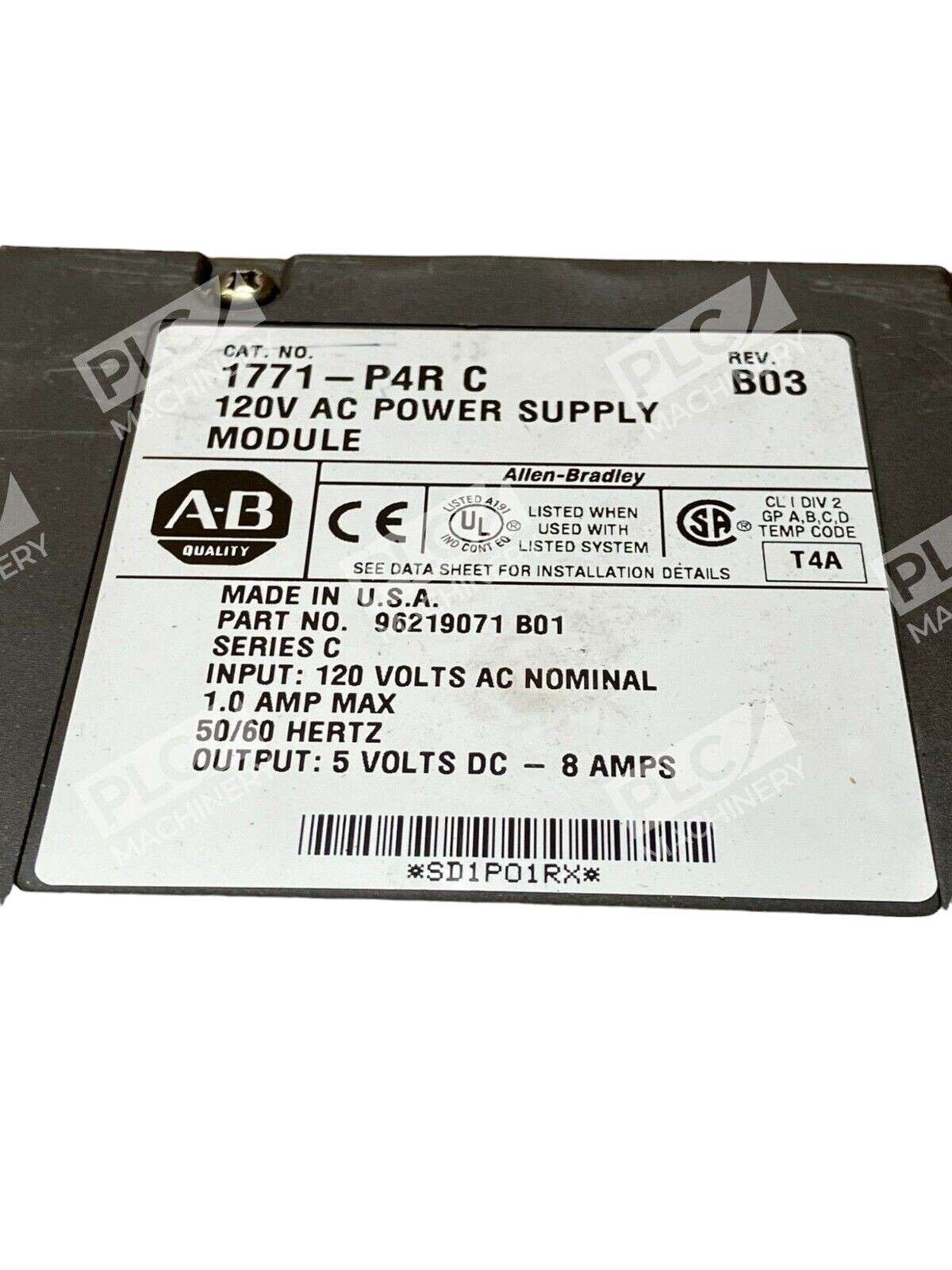 This Allen Bradley 1771-P4R /C power supply module is a reliable solution for your industrial automation needs. With a voltage input of 120V AC and compatibility with the 1771 series, this used module is perfect for your PLC peripheral modules. The m