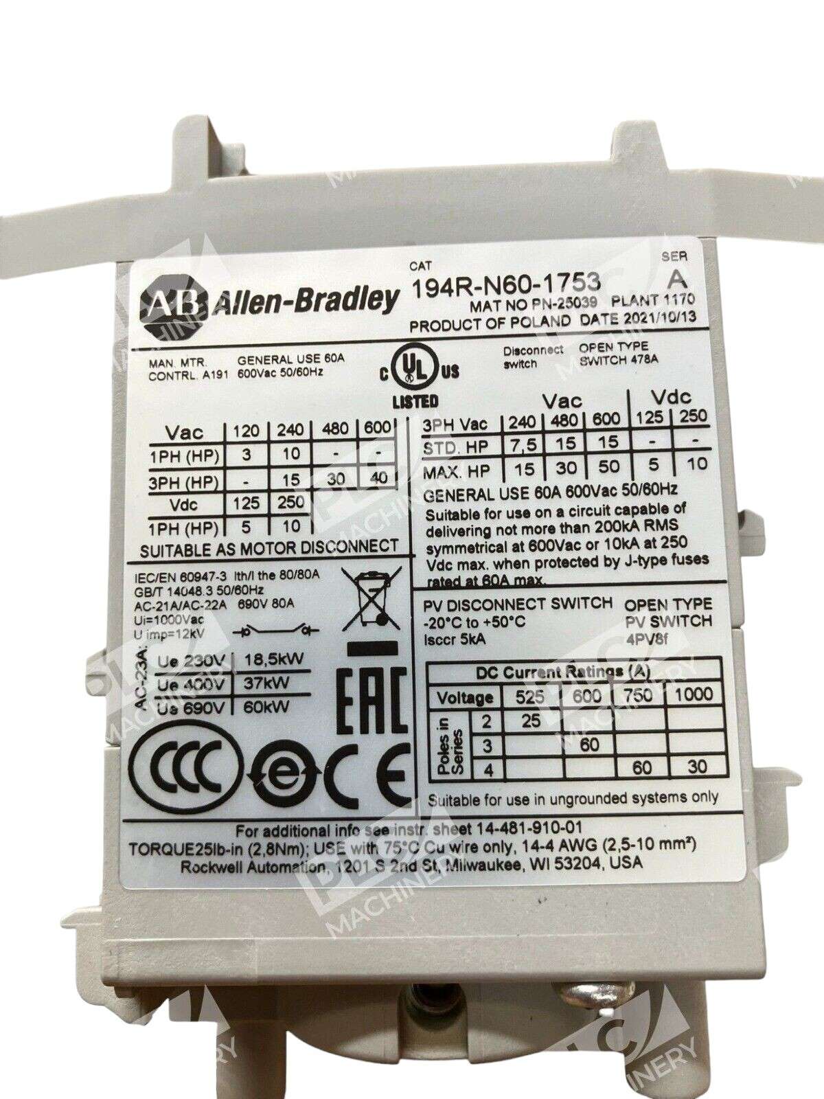 This Allen Bradley 194R-N60-1753 /A Switch Disconnector is a high-quality piece of electrical equipment that is perfect for any industrial setting. With a product brand and model number of ALLEN BRADLEY 194R-N60-1753, this switch disconnector is desi