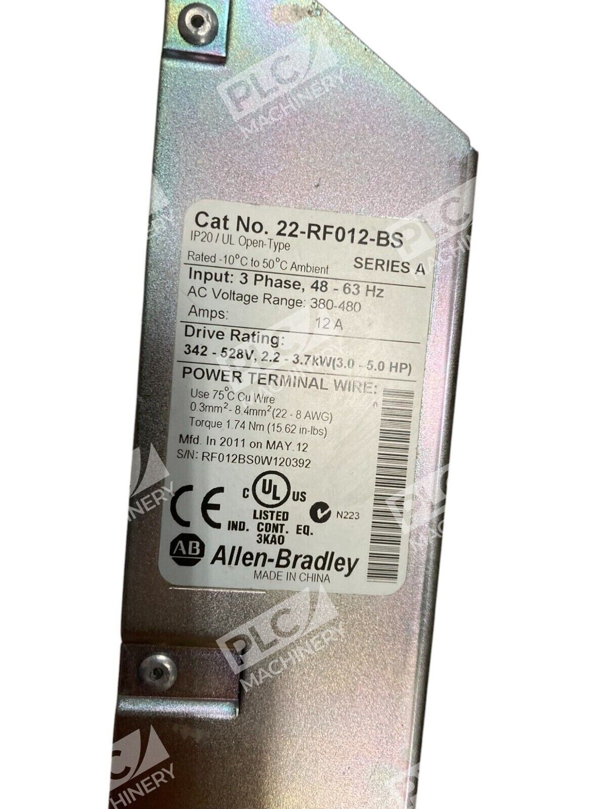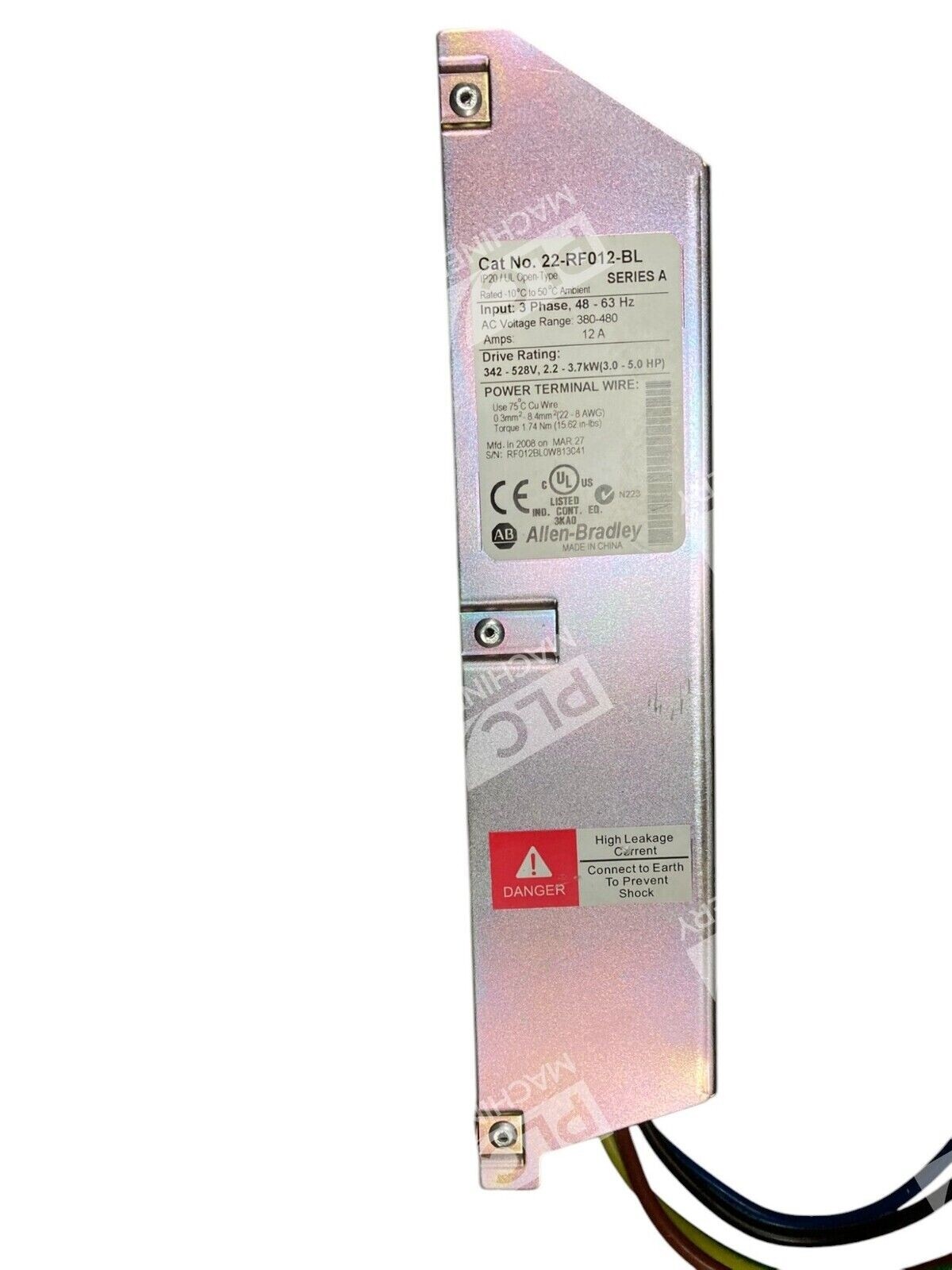 The product is an Allen-Bradley 12A 3 Phase Line Filter with model number 22-RF012-BS/A. It is designed to filter electrical interference in three-phase power systems.