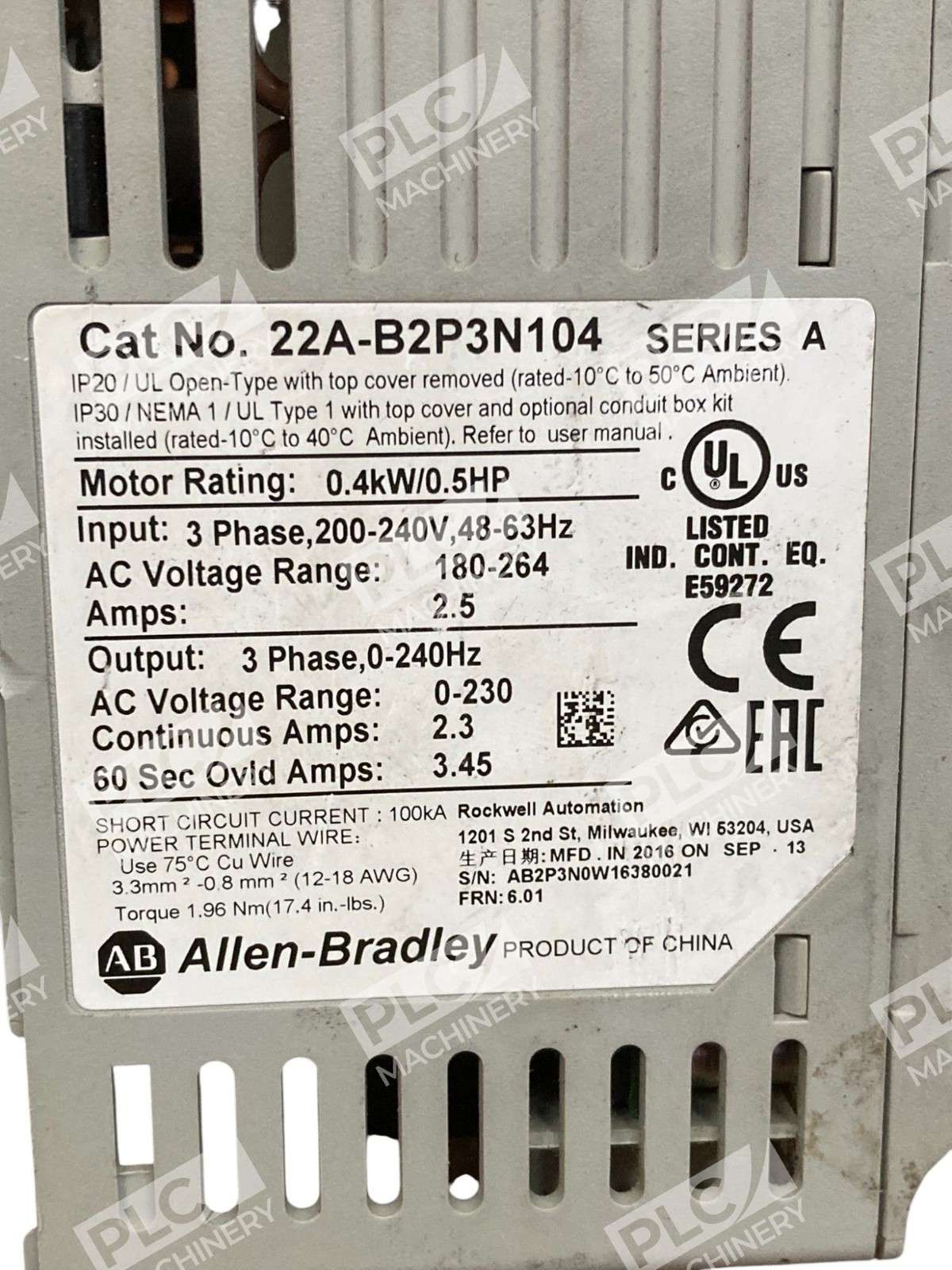 22A-B2P3N104 Series A – Allen-Bradley – 0.4kW/0.5HP 3 Phase AC Drive