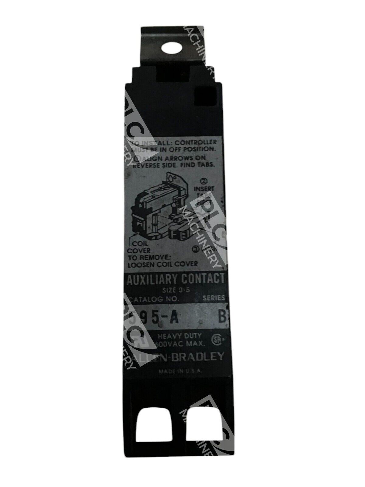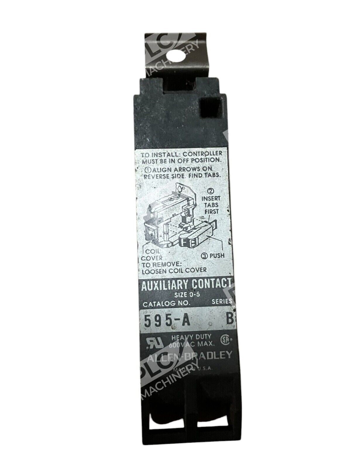 The product is an Allen Bradley 600VAC Size 0-5 Side Mount Auxiliary Contact, model 595-A Series B. It is manufactured in the United States and does not come with any custom modifications. It is designed for industrial use and is compatible with Allen-Bradley brand equipment.