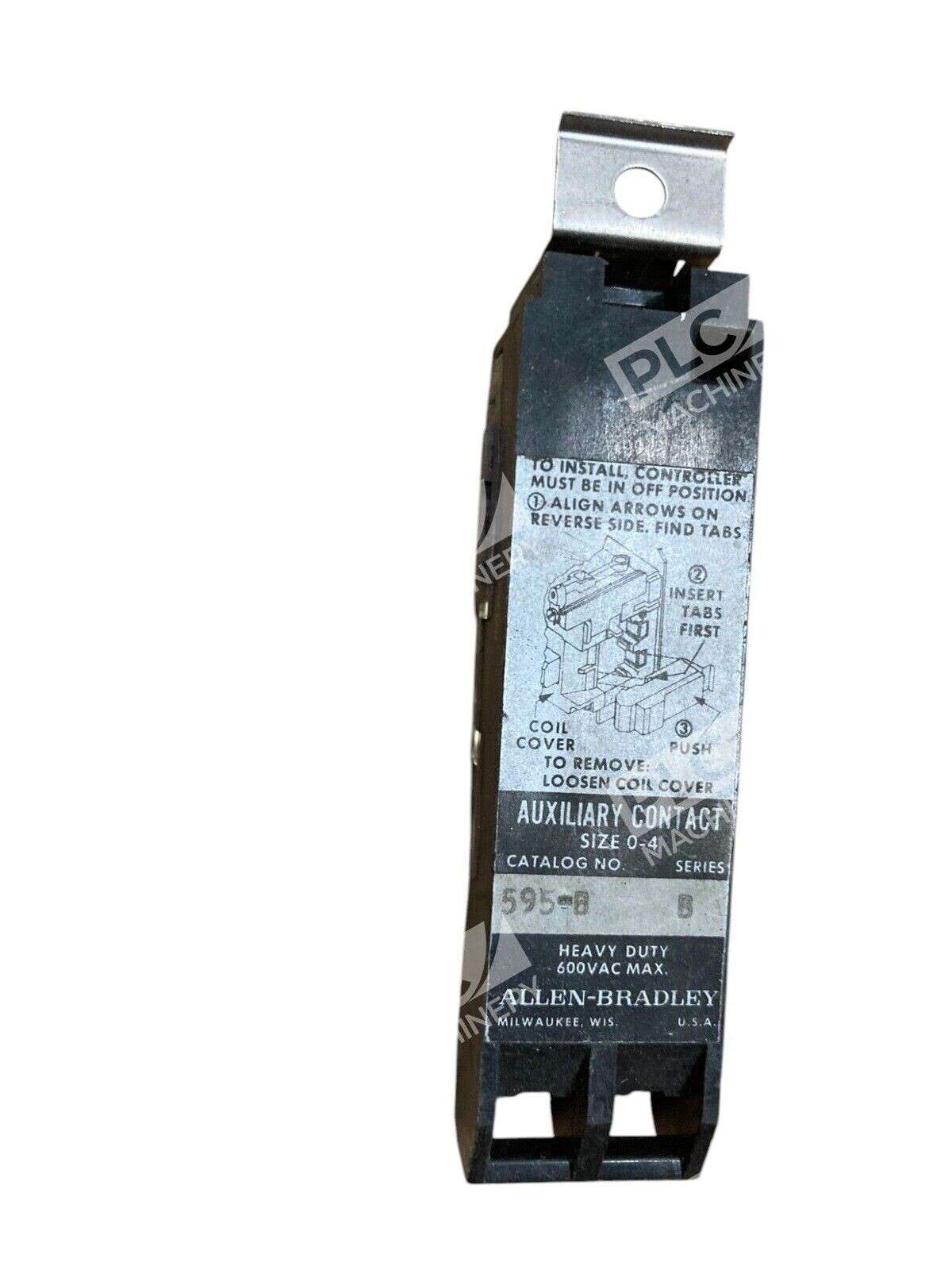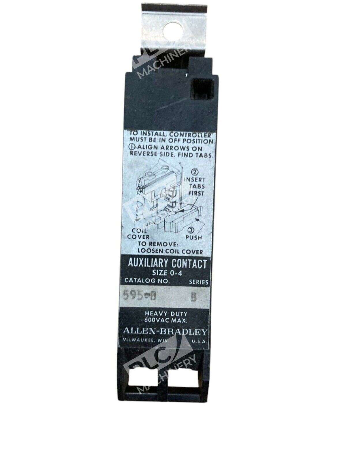 The Allen-Bradley 600VAC Size 0-4 Auxiliary Contact Block 595-B is a component designed for use in electrical equipment and industrial applications. This product is specifically made for Allen-Bradley brand equipment and is compatible with Size 0-4 r