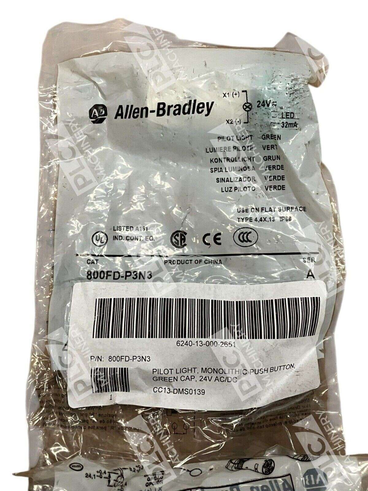 The Allen-Bradley 800FDP3N3 model is a 24V LED pilot light with a green button color. It is designed for industrial use and manufactured in China. This pushbutton switch is equipped with a 32mA current type, making it suitable for AC/DC applications. The pilot light provides visual indication and is a reliable choice for various electrical equipment needs.