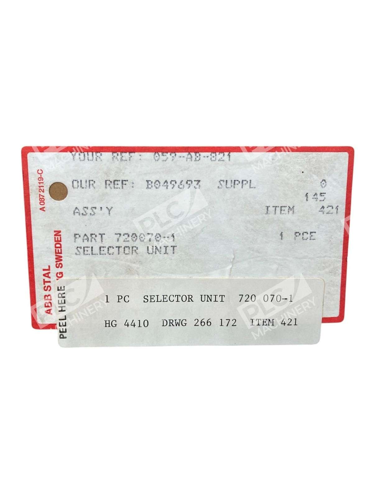 The ABB Stal Selector Unit 720070-1 is a product from ABB STAL designed for use in electrical equipment and supplies. It is located in the inventory MF2 6-6. This unit is likely a specialized component or accessory that serves a specific purpose in industrial or business settings. Overall, it is a reliable and essential part for maintaining and operating electrical equipment efficiently.