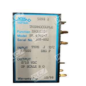 The AGM Electronics EA 4002-7 Thermocouple Isolator is a high-quality product designed for precise temperature measurement between 0-500°F with a 0-10V output. Made in the United States by AGM Electronics, this unit features a Type J thermocouple and is ideal for use in a variety of industrial applications. With its reliable performance and durable construction, this thermocouple isolator is a valuable tool for ensuring accurate temperature readings in a range of settings.