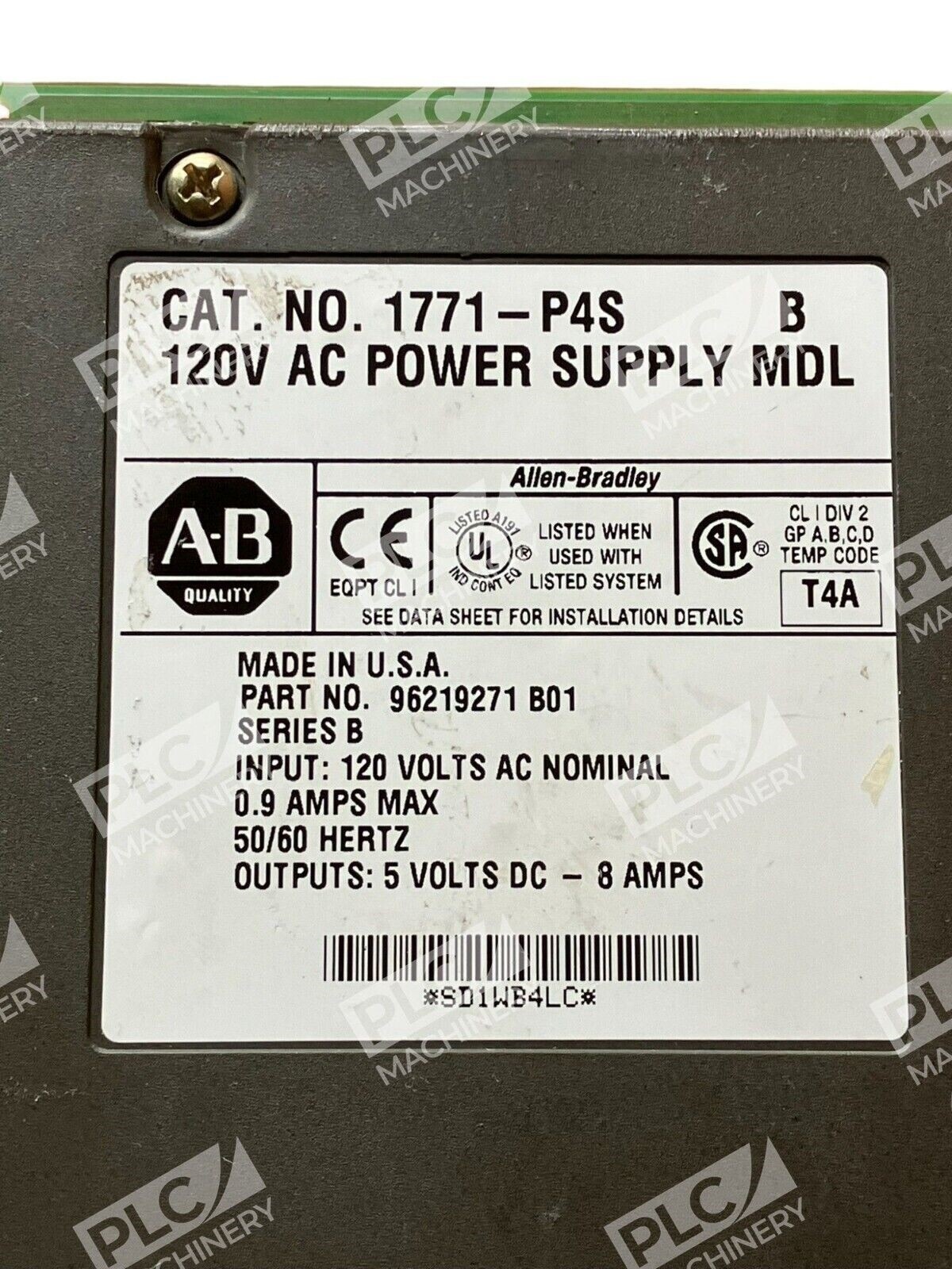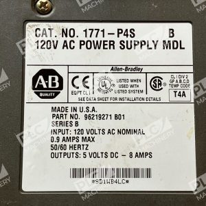 This Allen Bradley 1771-P4S /B 120V AC Power Supply Module is available for purchase in a used condition. The module is part of the SER B series and is compatible with PLC Power Supplies, PLC Peripheral Modules, PLCs & HMIs, and Industrial Automation & Motion Controls. It is a reliable and well-known product brand in the industry.