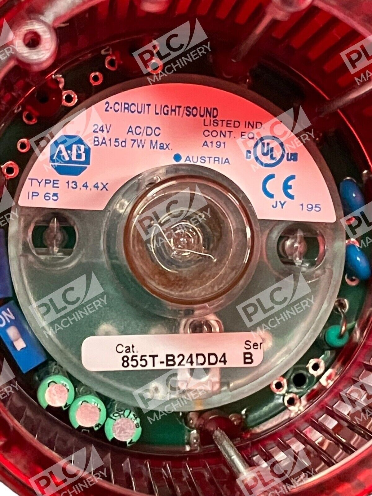 The product is an Allen-Bradley 2-Circuit Light/Sound in red color, model 855T-B24DD4. It is manufactured in Austria and falls under categories like Strobe & Beacon Lights and Facility Maintenance & Safety.