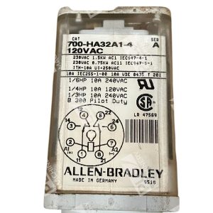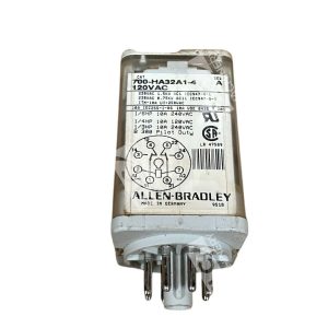 The product is an Allen Bradley 2 Pole 10A 120VAC Relay with the model number 700-HA32A1-4/A. It is designed to control electrical circuits by opening and closing contacts in response to a signal. The relay has two poles, allowing it to control two separate circuits, and can handle up to 10 amps of current at 120 volts AC.