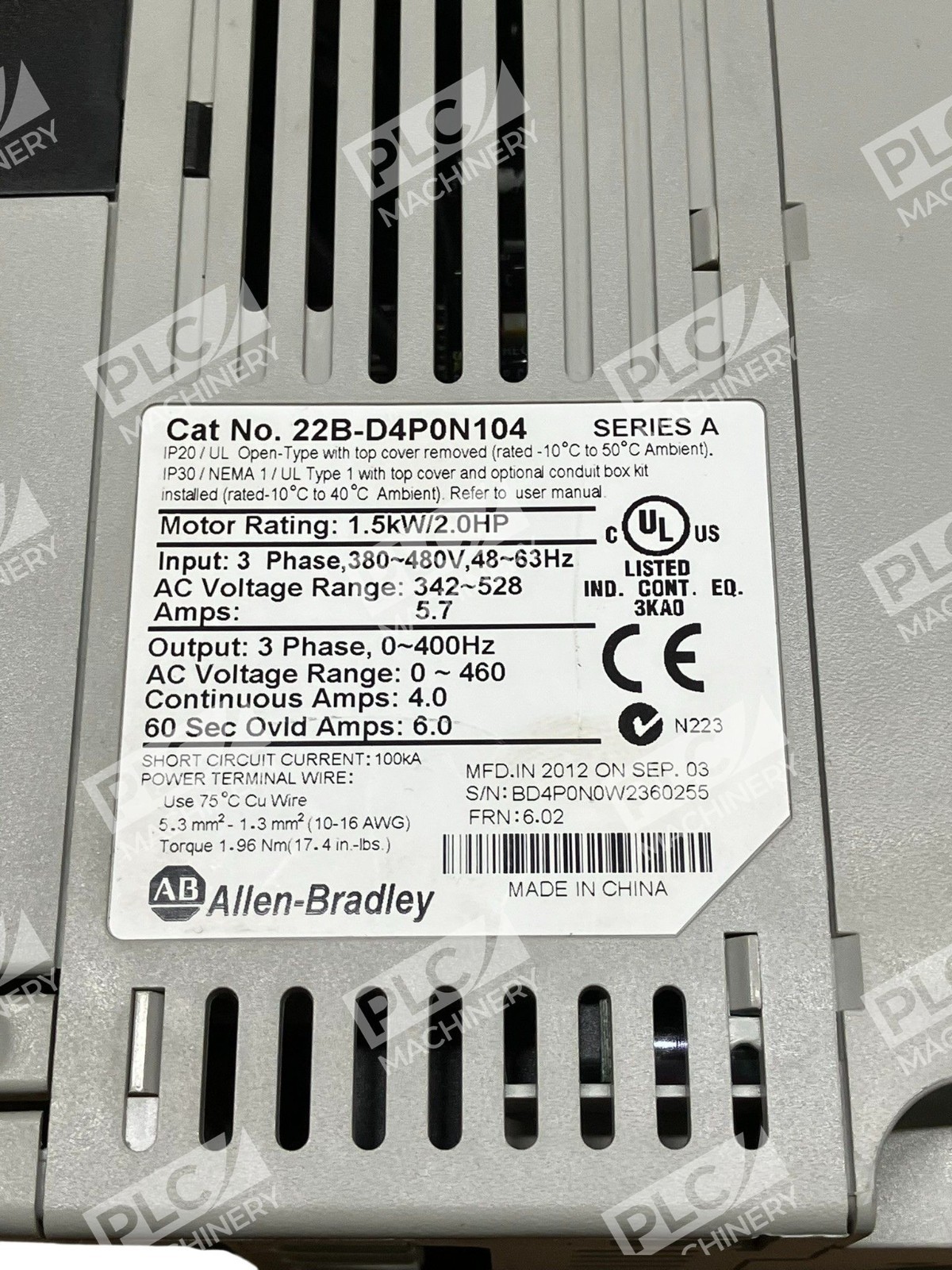 The product is an Allen Bradley AB 1.5kW/2.0HP PowerFlex40 22B-D4P0N104 variable frequency drive. It is manufactured by Allen-Bradley / Rockwell Automation in China. This drive is designed for industrial automation and motion control applications, providing reliable and efficient control of motors in various industrial settings. With the trusted brand name and specific model number, users can depend on this product to meet their motor control needs with high performance and durability.
