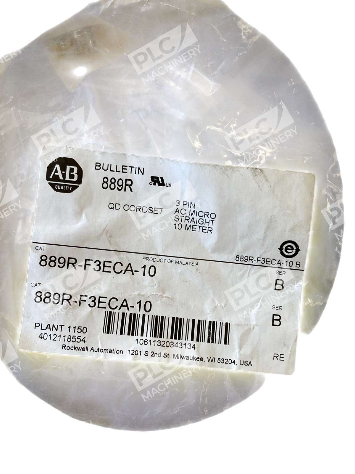 The Allen Bradley AB 3 Pin AC Micro Straight 10 Meter QD Cordset 889R-F3ECA-10 /B is a high-quality power cord designed for use in various industrial and commercial applications. With a length of 10 meters, this cordset is perfect for connecting electrical devices and ensuring a reliable power supply. The Allen-Bradley brand is known for its durability and performance, making this cordset a trustworthy choice for any business or industrial setting.