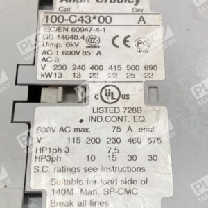 The Allen Bradley AB C43 Three Pole Contactor, catalog number 100-C43*00 /A, is a robust and reliable solution for controlling electric motors in industrial applications. Designed to meet IEC standards, this contactor ensures efficient performance and durability.