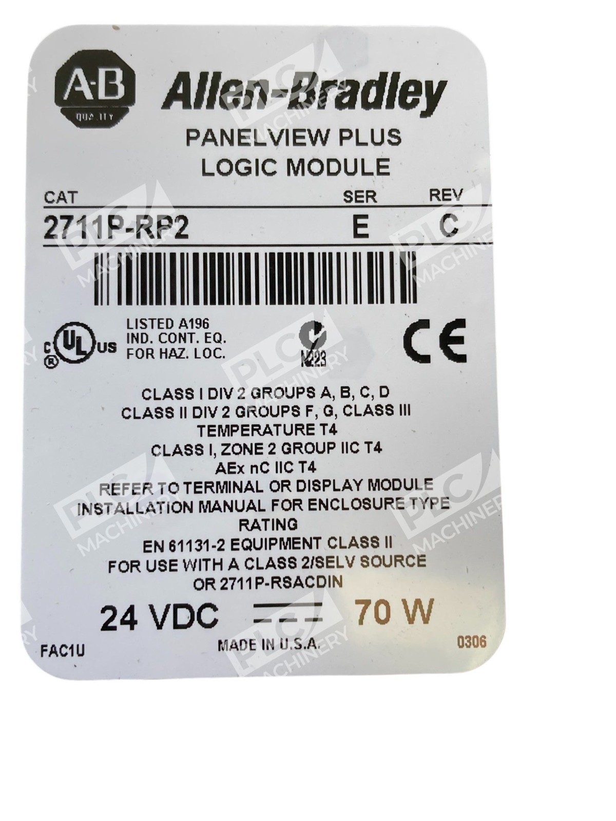 The Allen Bradley AB Logic Module Panelview Plus 2711P-RP2 /E Rev C is a programmable logic controller (PLC) made by Allen Bradley in the United States. This specific model is designed for industrial automation and motion control applications, providing users with a reliable and efficient solution for controlling and monitoring various processes. With its advanced features and capabilities, this PLC is widely used in businesses and industries to streamline operations and improve productivity.