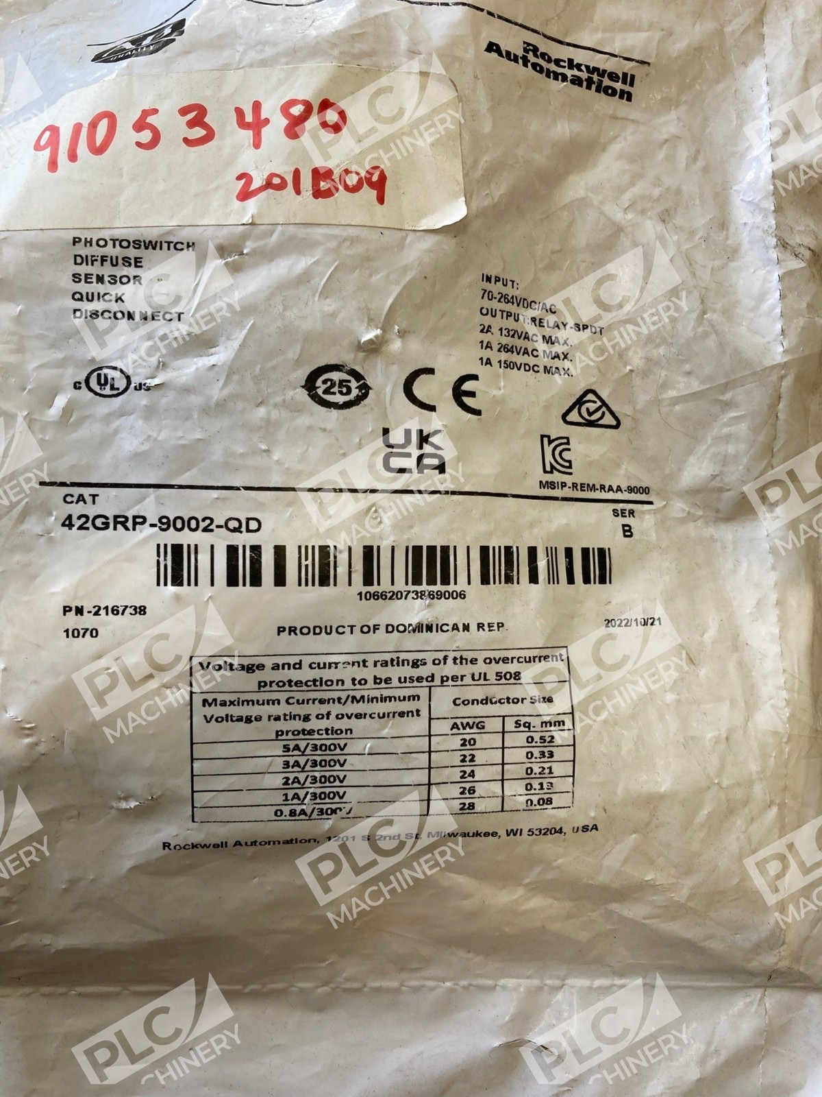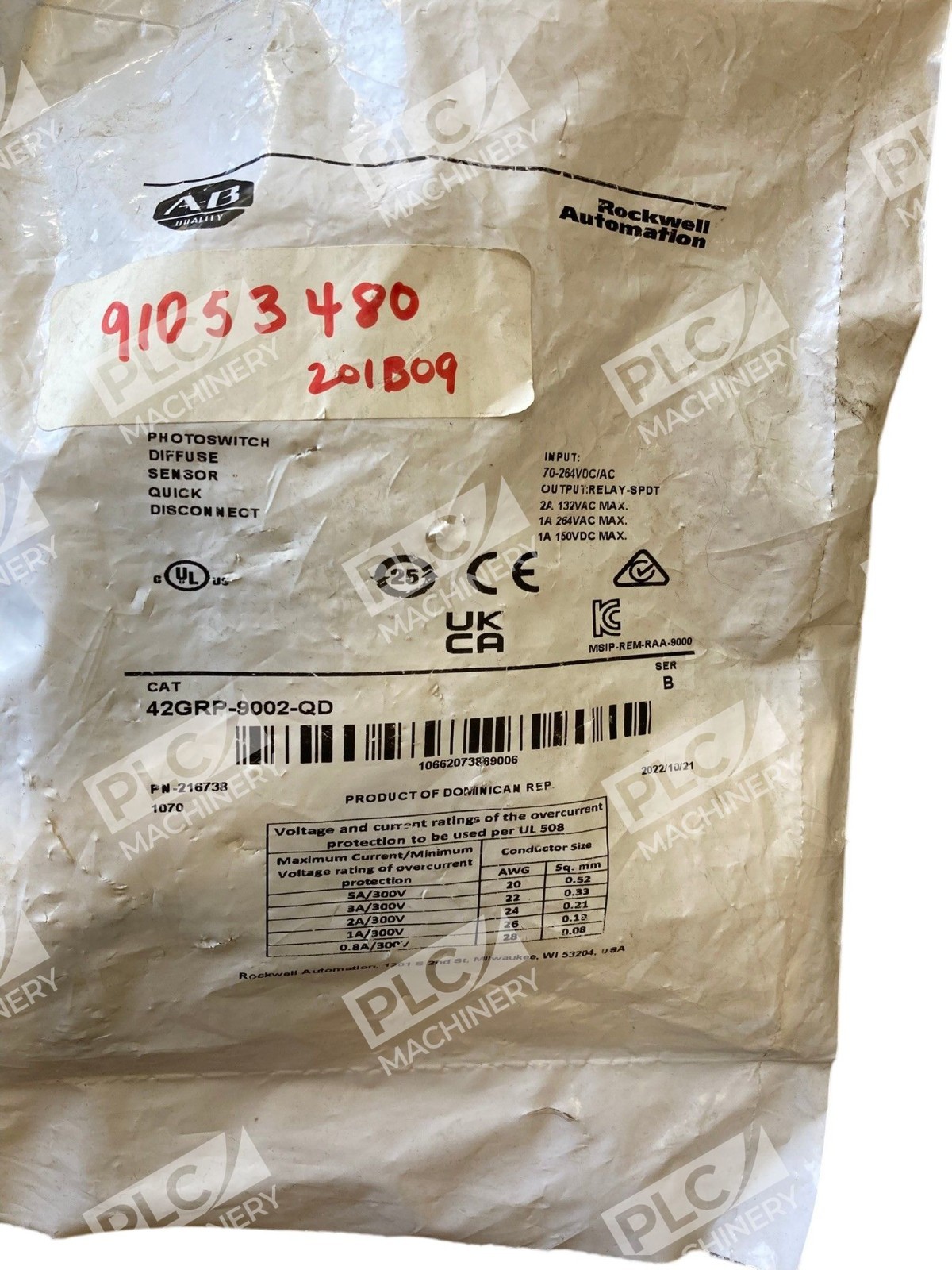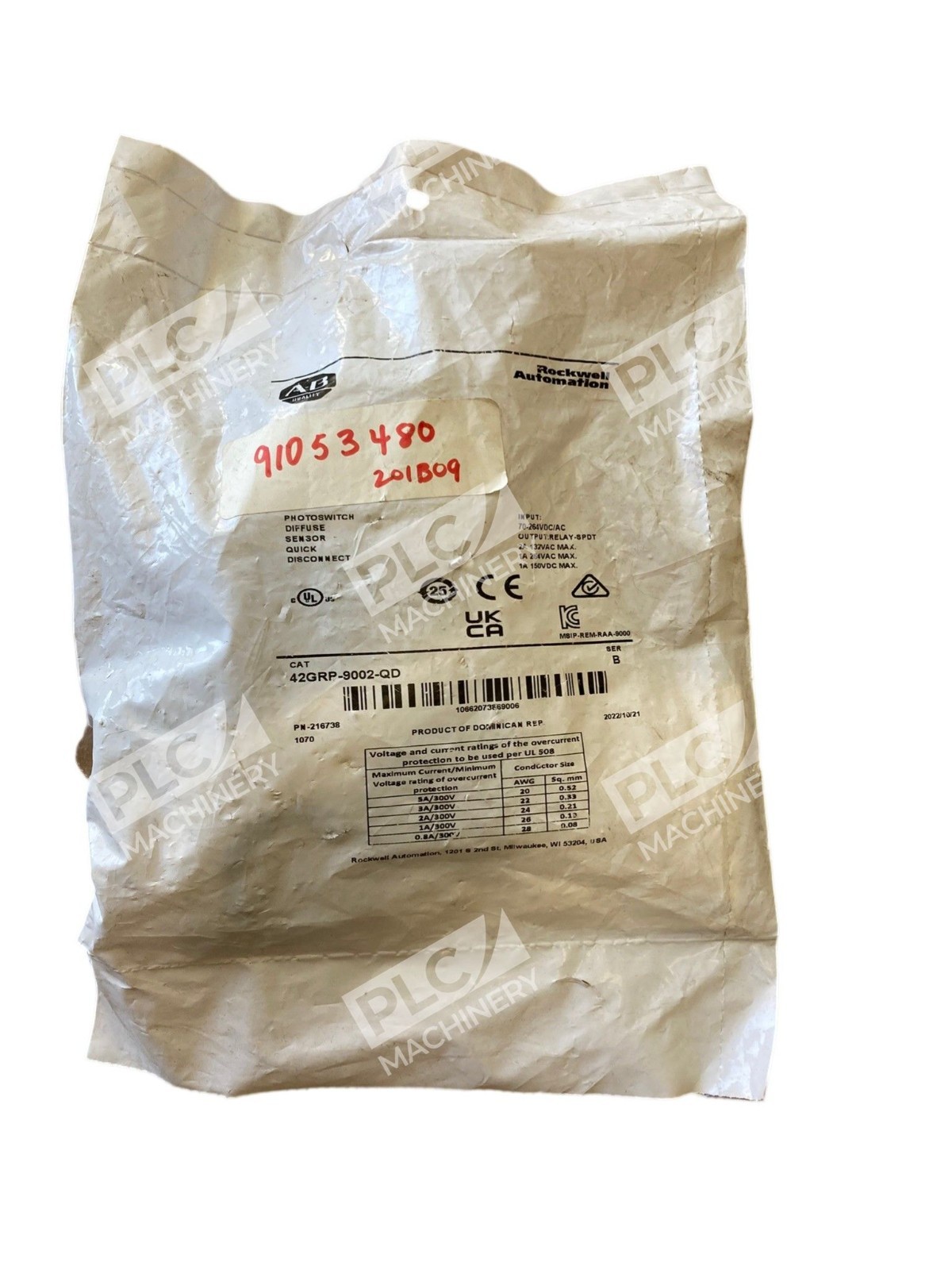 The Allen Bradley AB Photoswitch Diffuse Sensor Quick Disconnect 42GRP-9002-QD /B is a reliable electrical device designed for industrial use. Manufactured by Allen-Bradley, a well-known brand in the industry, this disconnect offers quick and easy installation due to its quick disconnect feature. Originating from the Dominican Republic, this product ensures quality and performance in various electrical circuits.