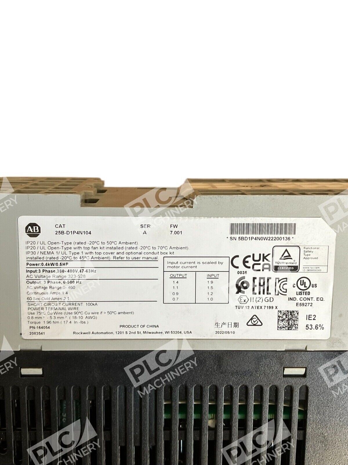 The drive features a 480V input voltage and is engineered with a 3-phase configuration to accommodate common power systems. Its IP20, open enclosure is designed for ease of installation and access, while adhering to NEMA standards for electrical enclosures. Trust in the renowned quality of Allen-Bradley to enhance your system’s performance and longevity.
