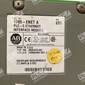 The Allen-Bradley 1785-ENET is an Ethernet Interface Module designed for PLC-5 controllers. This module allows for communication over an Ethernet network, enhancing connectivity and data transfer capabilities for industrial automation applications.