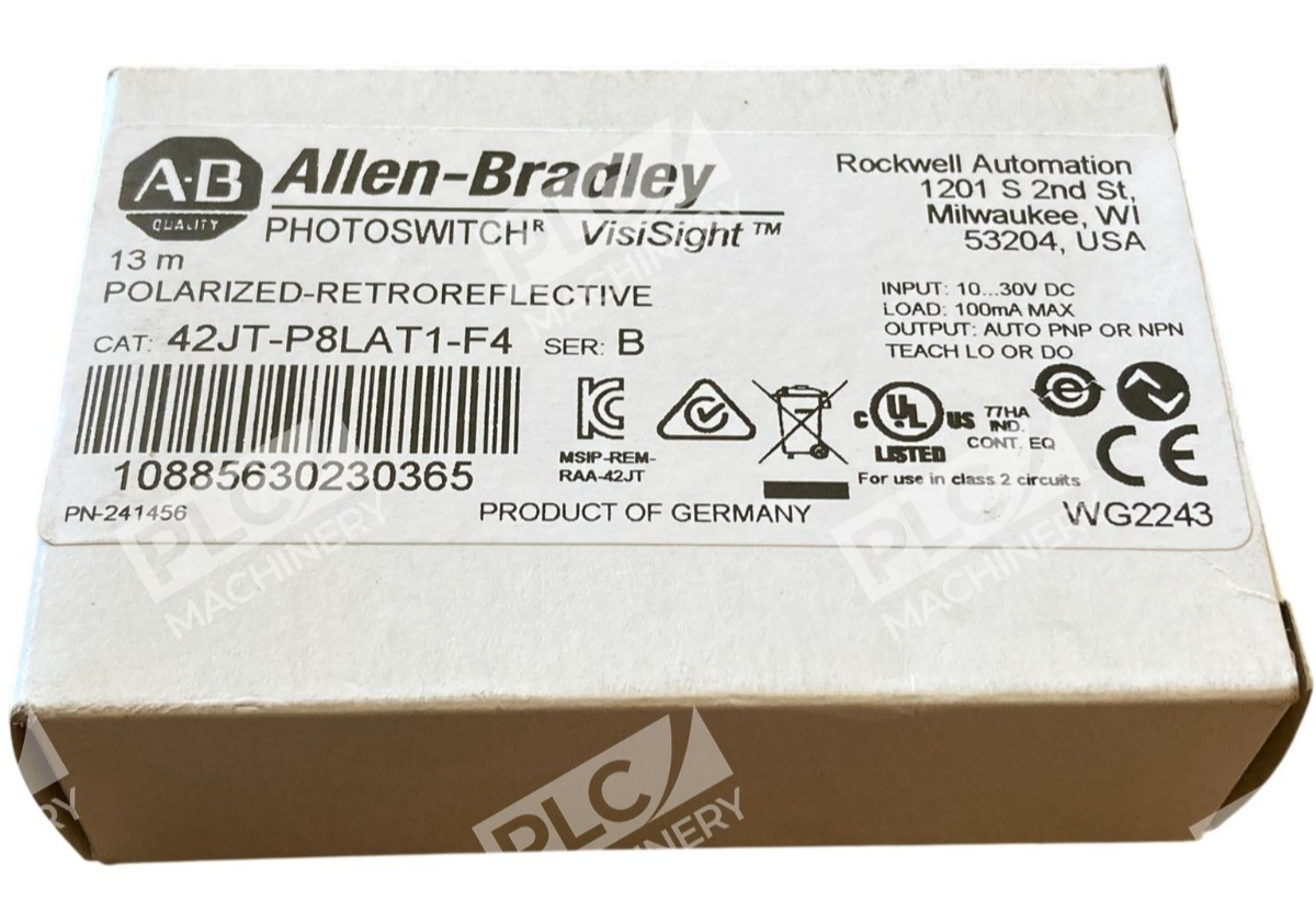 The Allen Bradley VisiSight Polarized Retroreflective Photoswitch 42JT-P8LAT1-F4 /B is a solid-state sensor designed for industrial automation and motion control applications. This digital output sensor by Allen-Bradley is suitable for DC current type and features an unshielded design. With its specific product number, this photoswitch is ideal for use in various industrial settings where precise sensor technology is needed for reliable operation.