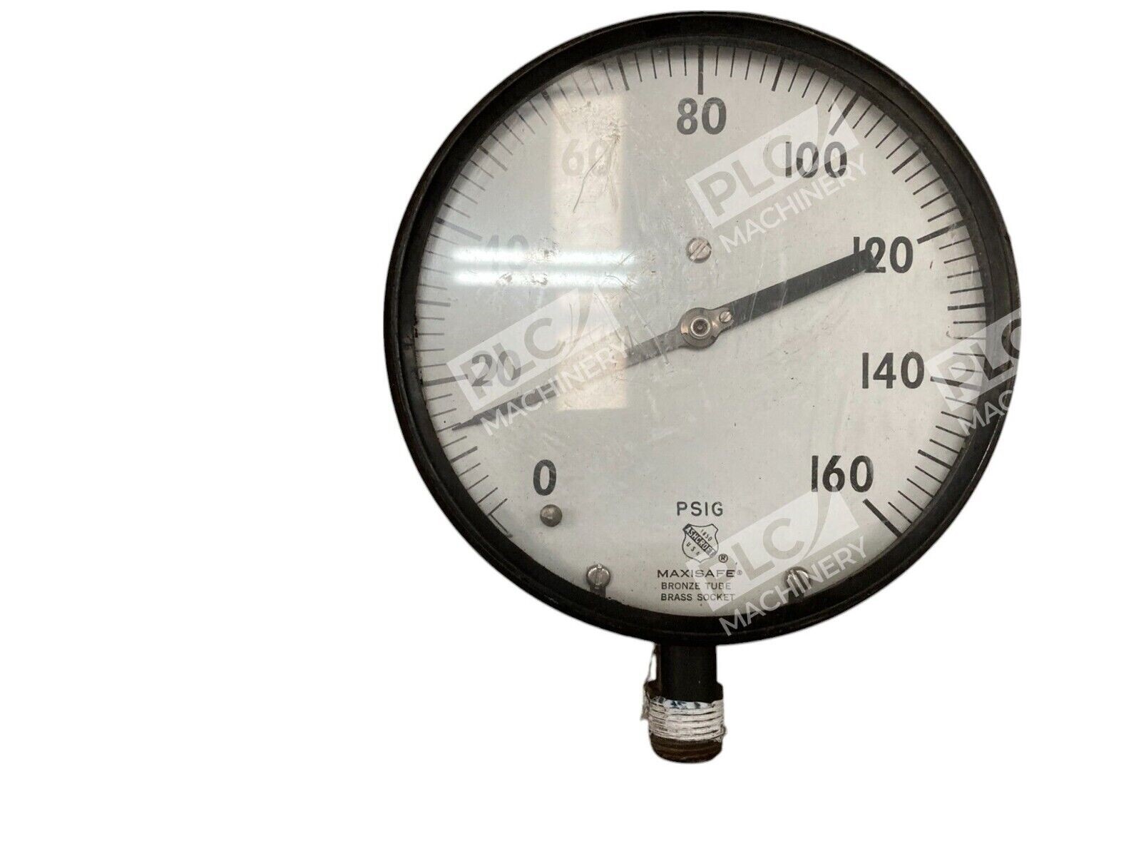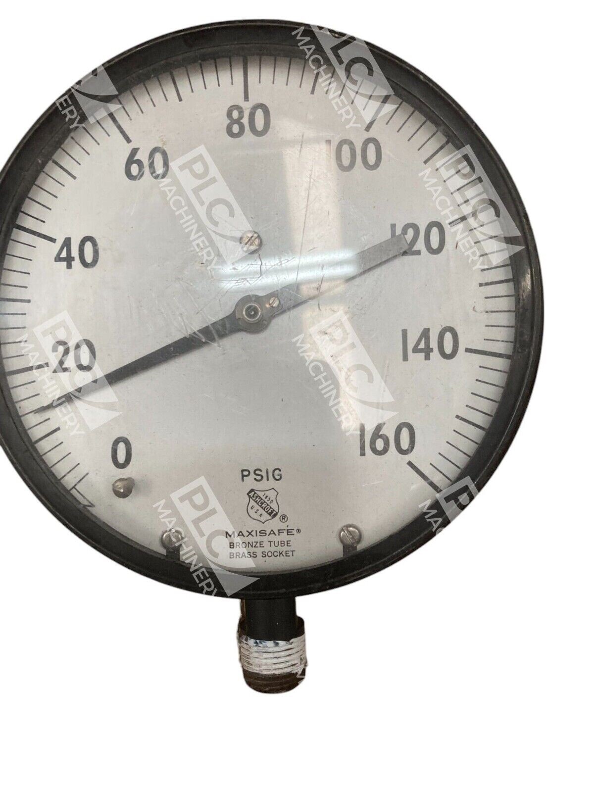 This is an Ashcroft Maxisafe Pressure Gauge with a face diameter of 4.5 inches and a connection diameter of 1/2 inch. It has a maximum pressure of 160 psi and is manufactured in the United States. The model number is 1196012 and the product code is 24749.