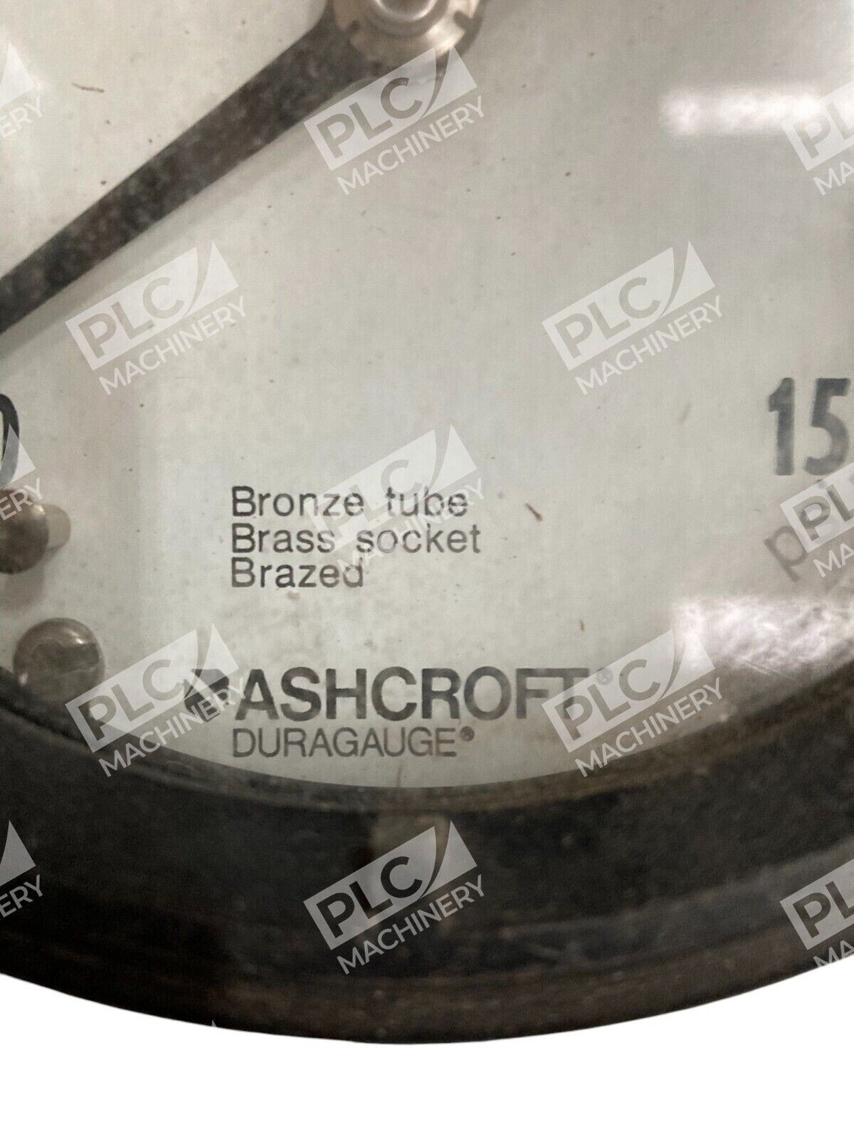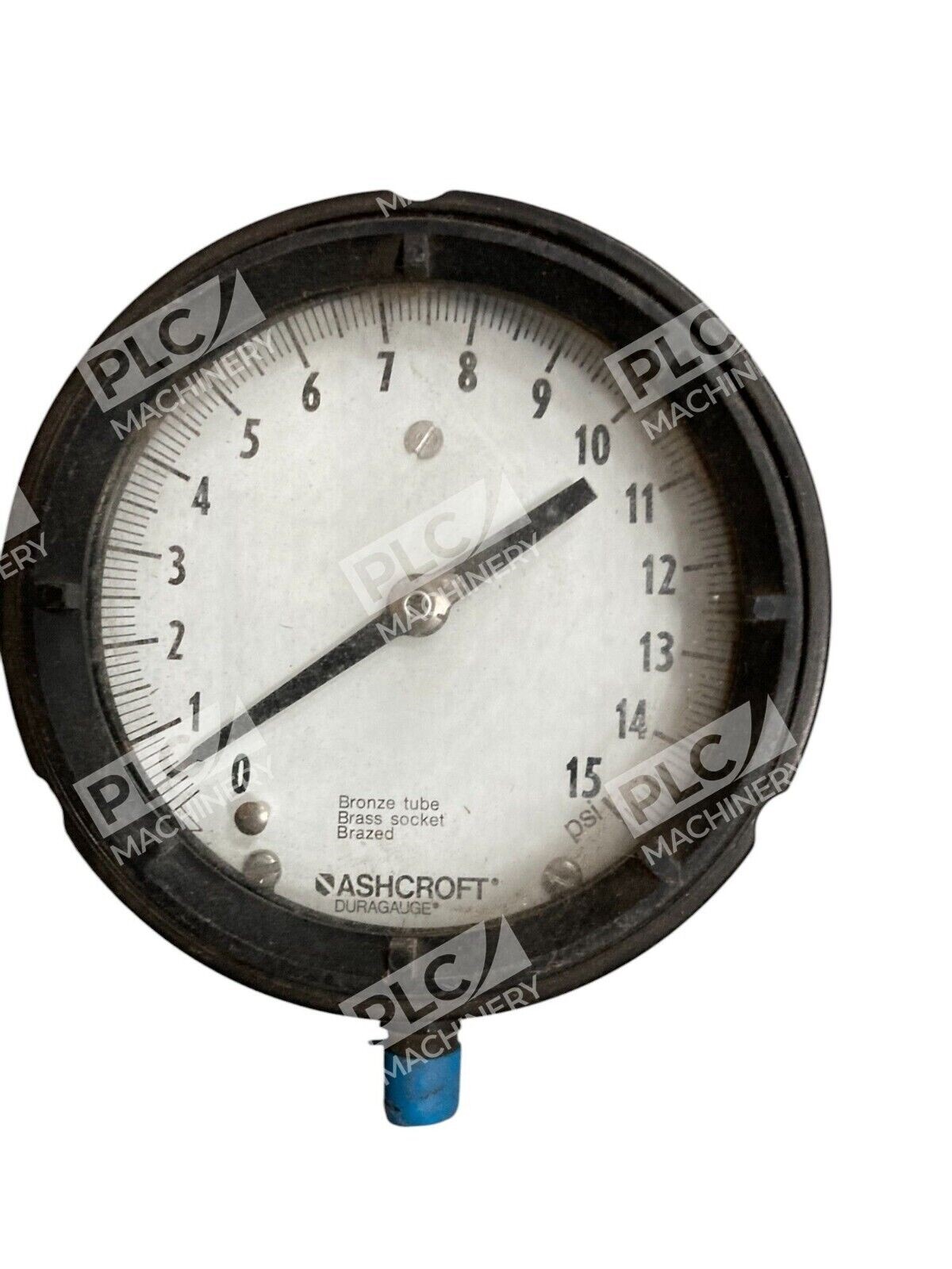 The Ashcroft Duragauge Bronze Tube Brass Socket Brazed Pressure Gauge has a maximum pressure of 15 psi (1 bar). It is suitable for measuring air pressure in various industrial applications.