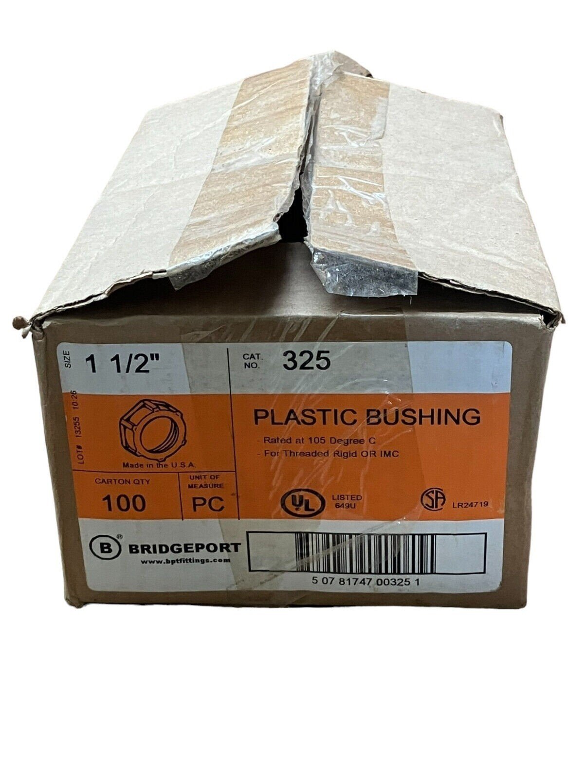 This package contains 100 Bridgeport 325 plastic bushings, each rated for 105 Degree C. These bushings can be used with conduit fittings and tubing made of various materials. The brand is Bridgeport and the material used is plain plastic. They are ideal for use in electrical equipment and supplies in business and industrial settings.
