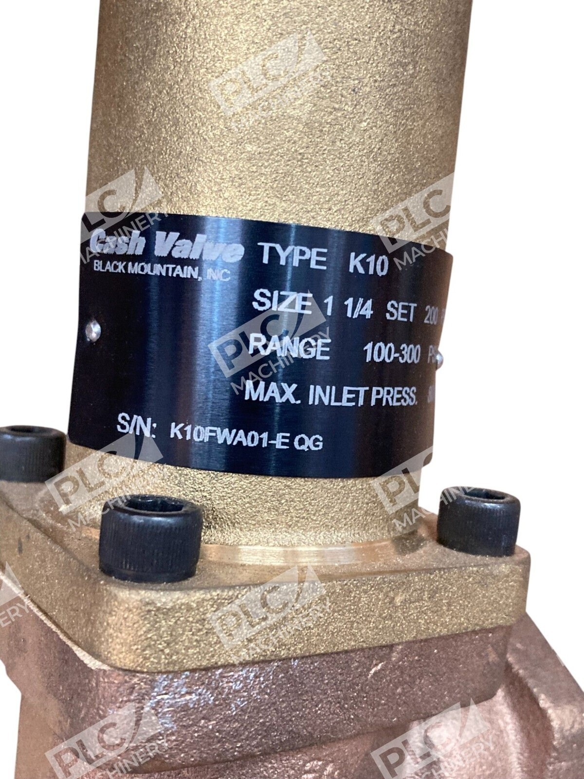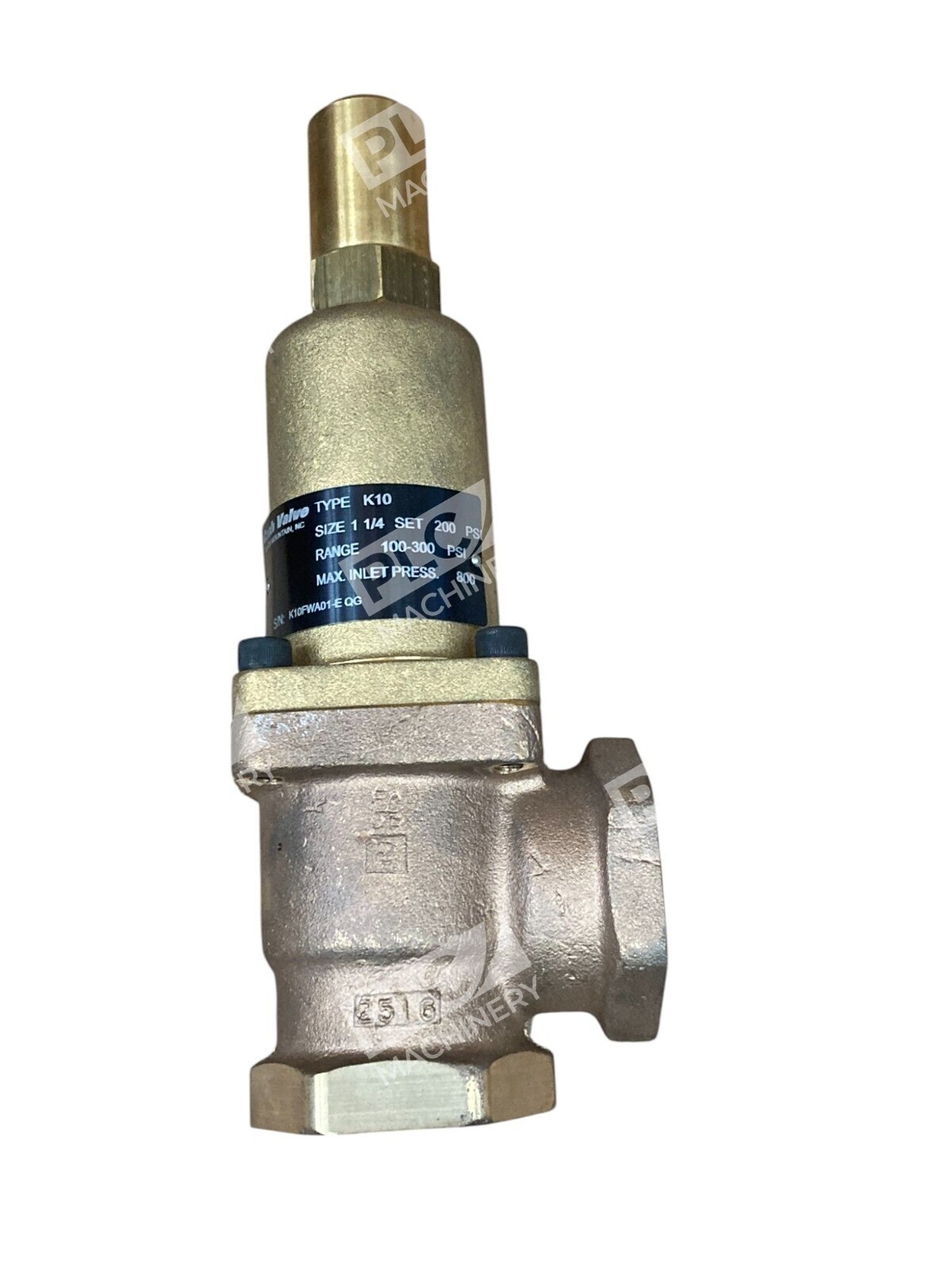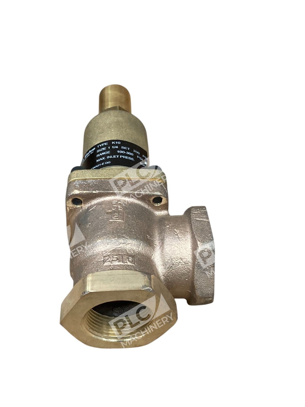 The Cash Acme K10FWA01-E QG 1-1/4 200PSI 100-300PSI Type K10 relief valve is a high-quality brass valve designed for industrial use. This valve features a 1-inch inlet diameter and outlet diameter, with a maximum adjustable pressure of 300 psi and a minimum adjustable pressure of 100 psi. The model K-10 is known for its durability and reliability, making it a dependable choice for various hydraulic, pneumatic, and plumbing applications. This relief valve is a great addition to any system requiring precise pressure control and maintenance.