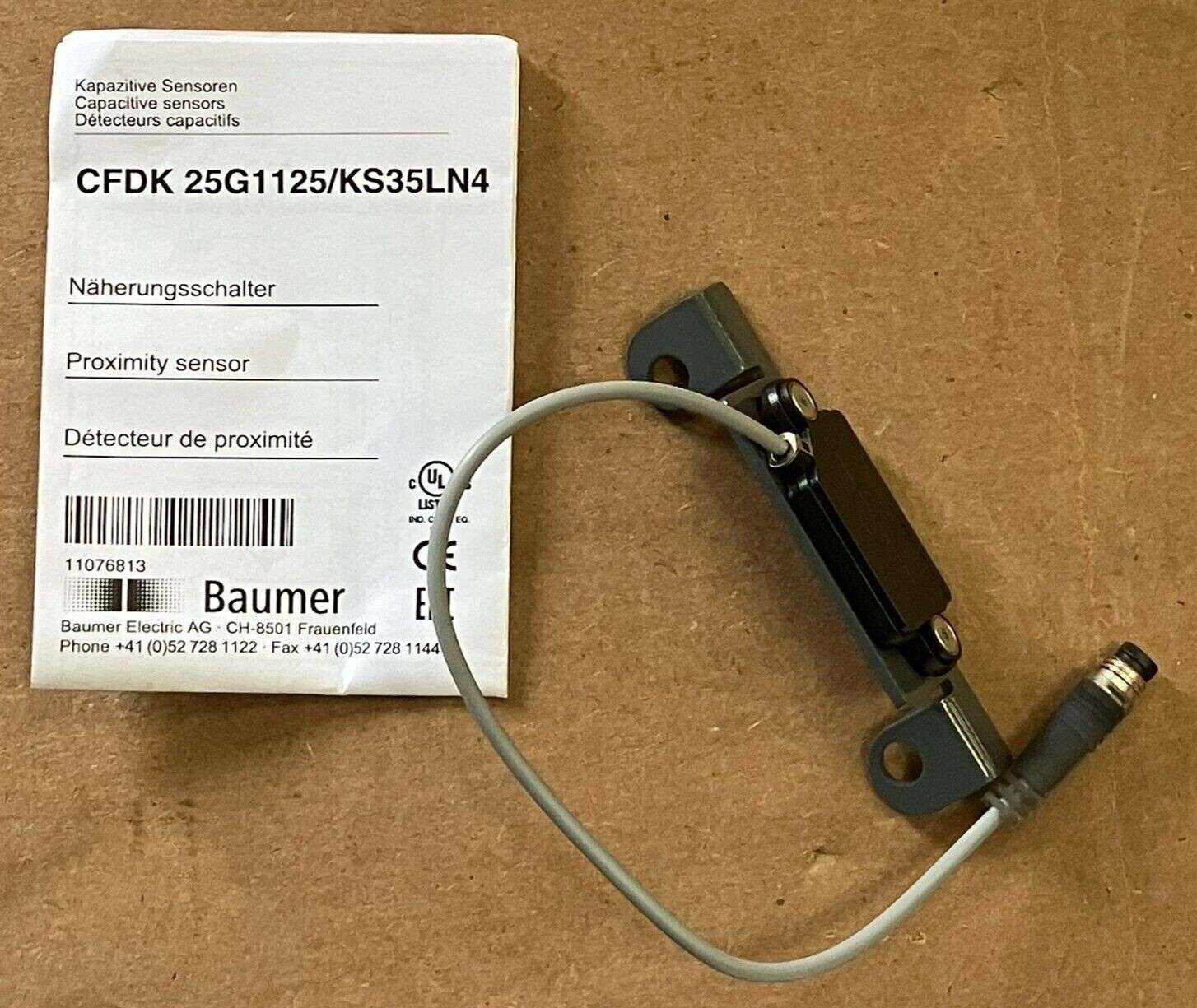 Baumer CFDK 25G1125/KS35LN4 Block Proximity Sensor The Baumer CFDK 25G1125/KS35LN4 is a capacitive proximity sensor designed for precise detection of non-conductive materials and fill level monitoring through container walls. Its compact, flat housin