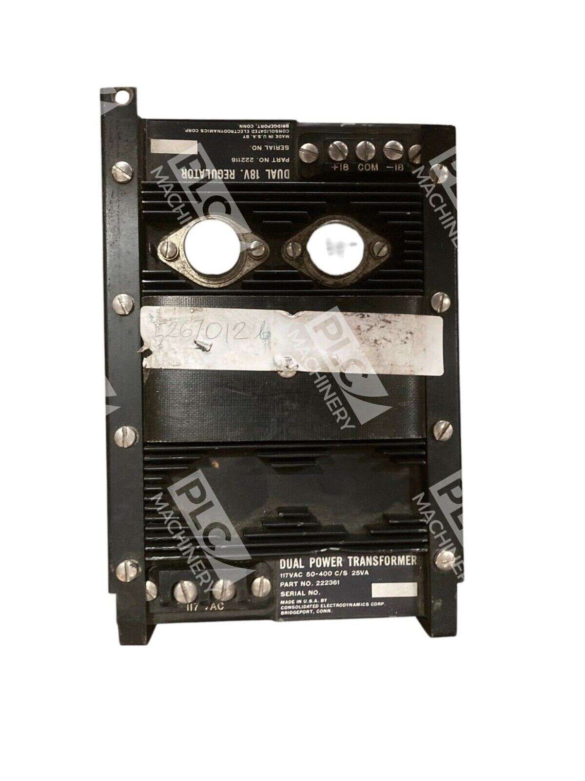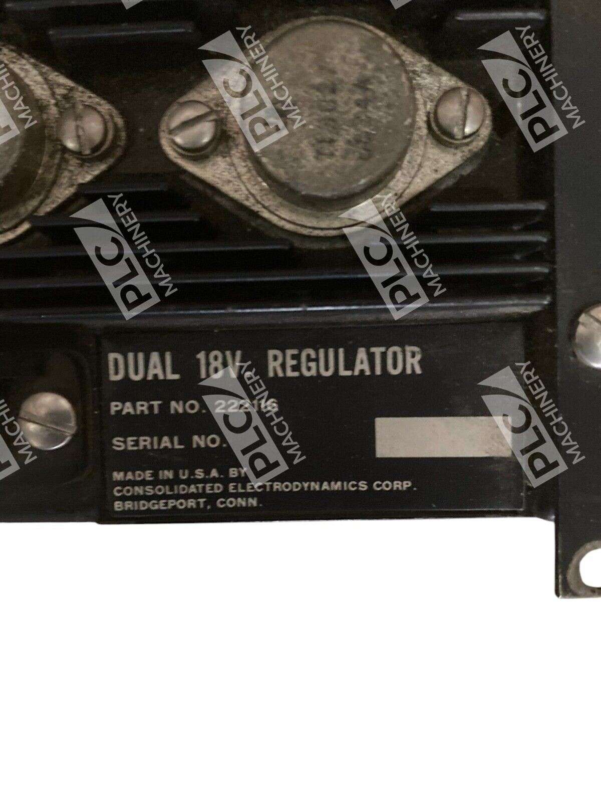 The product is a Consolidated Electrodynamics Dual 18V Regulator model 19-601A 222361 222116 with a transformer. It operates on 117V-AC and 18V-DC voltage, providing a current of 300mA. The brand is DEVAR, and the reference SKU is 986722. It falls under the category of Other Electrical Equipment & Supplies in the Business & Industrial sector.