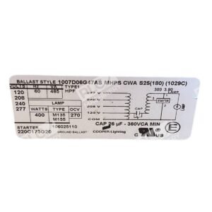 The Cooper Lighting 220C173G20 Ballast, paired with the Aerovox Z93S4026M01A3 Capacitor, offers a reliable solution for high-intensity discharge (HID) lighting systems. This combination is engineered to ensure optimal performance and longevity in various lighting applications.