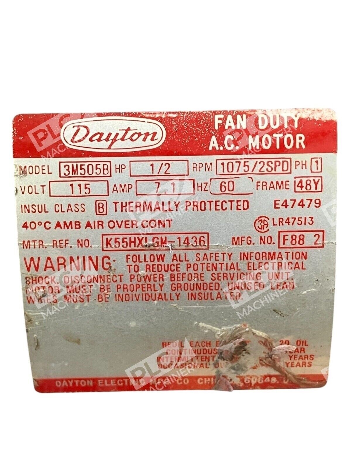 Dayton Fan Duty AC Motor 1/2HP 1075RPM 1PH 115V 7.1A 48Y 3M505B K55HXLGM-1436Dayton Fan Duty AC Motor 1/2HP 1075RPM 1PH 115V 7.1A 48Y 3M505B K55HXLGM-1436