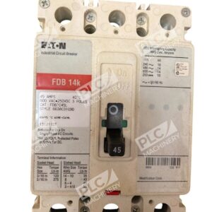 This Eaton circuit breaker is a 45A, 600VAC, 250VDC, 3-pole FDB 14k model, part number FDB3045L. It is under the brand CUTLER HAMMER.