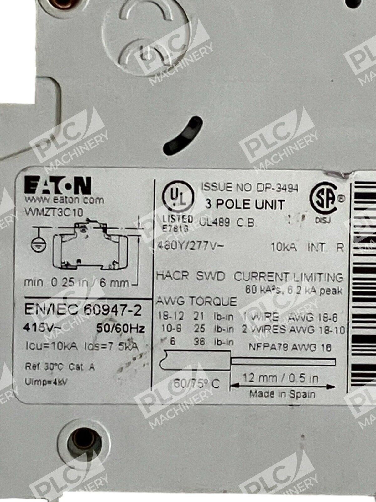 This Eaton Circuit Breaker is a top-quality product that is perfect for any business or industrial electrical setup. With a voltage range of 277 V-AC and 480 V-AC, this 10 A AMP circuit breaker is designed to provide maximum protection and safety for your electrical equipment. The model number is WMZT3C10 and it has 3 poles.