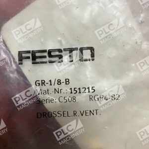 The product is a FESTO Feso 151215 RGP4-82 C508 Flow Control Valve GR-1/8-B. It is a valve used for controlling the flow of a fluid, likely in a pneumatic or hydraulic system. The product is designed to regulate the flow rate of the fluid and is part of the FESTO brand line of products.