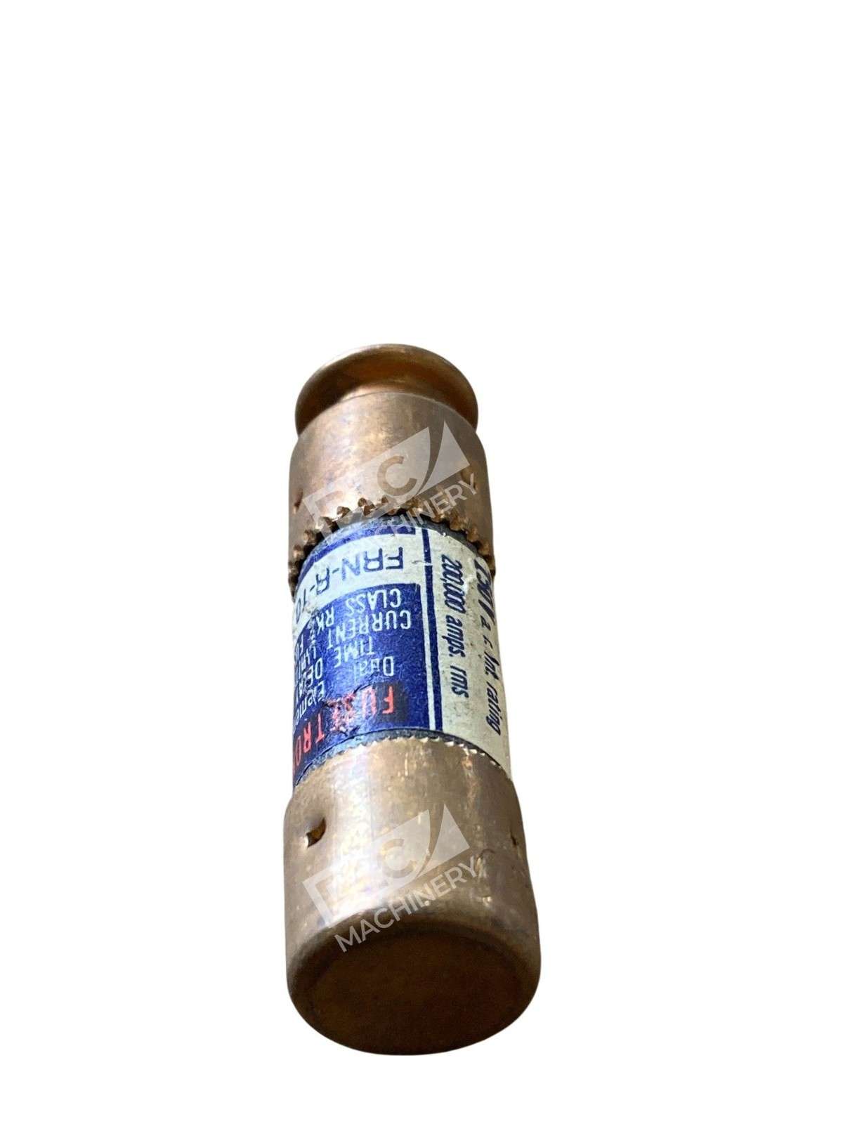 Bussmann Fusetron FRN-R-10 10A Time Delay Fuse Class RK5 250V The Bussmann Fusetron FRN-R-10 is a 10-amp, 250-volt, dual-element, time-delay fuse designed to provide reliable protection for motors and other inductive loads. As a Class RK5 fuse, it offers both overload and short-circuit protection, ensuring the safety and longevity of electrical systems. Key Features Dual-Element Design: Incorporates separate overload and short-circuit elements, allowing for precise sizing up to 125% of motor full load amperage (FLA). Time-Delay Capability: Provides a minimum of 10 seconds delay at 500% of rated current, accommodating temporary inrush currents without nuisance tripping. High Interrupting Rating: Rated at 200,000 amperes interrupting capacity (AIC) at 250 VAC and 20,000 AIC at 125 VDC, ensuring robust performance under fault conditions. Energy Efficiency: Fusetron fuses are on average 23% more energy efficient than the next leading brand, contributing to overall system efficiency. Versatile Applications: Suitable for use in power panelboards, motor control centers, combination starters, and machinery disconnects. Specifications Amperage Rating: 10 A Voltage Rating: 250 VAC / 125 VDC Interrupting Rating: 200 kA at 250 VAC; 20 kA at 125 VDC Fuse Class: RK5 Body Dimensions: 0.56 inches in diameter x 2 inches in length Material: Fiberglass Mounting Type: Holder Terminal Type: Ferrule Certifications and Standards UL Listed, Standard 248-12, Class RK5, Guide JDDZ, File E4273 CSA Certified, C22.2 No. 248.12, Class 1422-01, File 53787 CE Certified The Bussmann Fusetron FRN-R-10 fuse is engineered to deliver dependable protection and energy efficiency, making it an ideal choice for safeguarding motors and other critical components in various industrial applications.