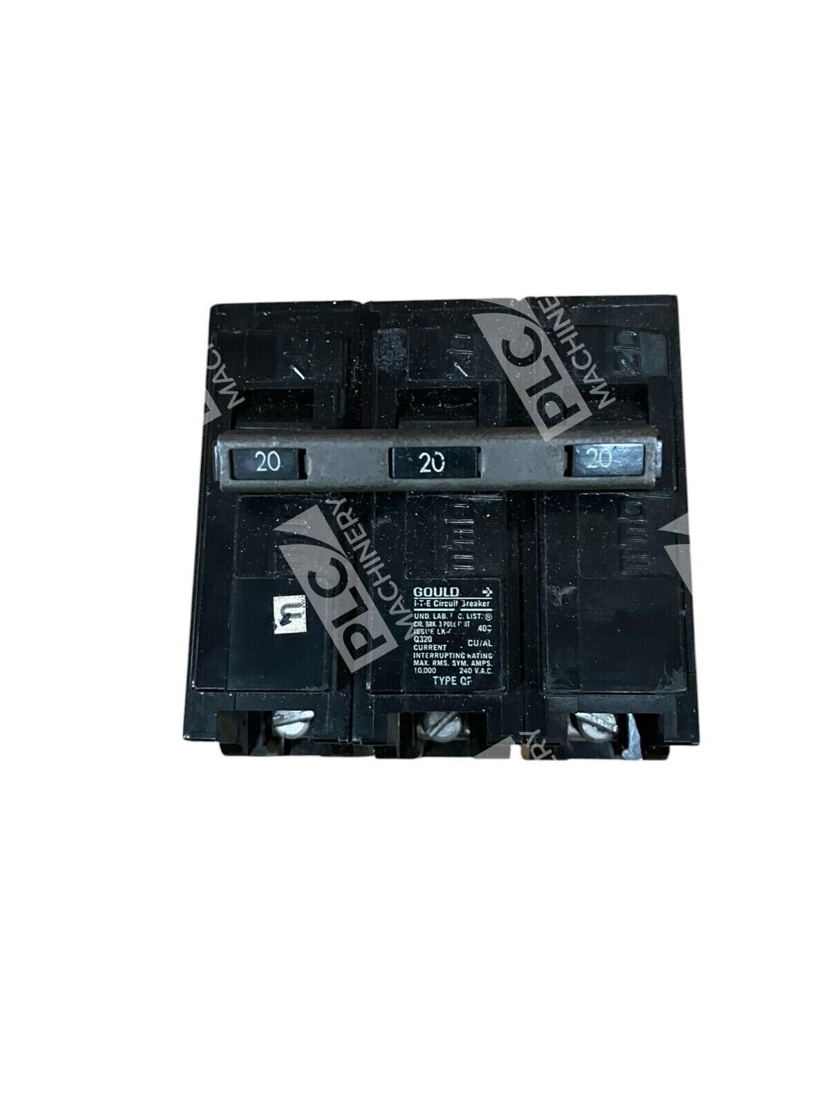 This is a Gould ITE Type QP Miniature Circuit Breaker with a maximum amperage of 20A. It is a 3-pole breaker designed for a voltage of 240VAC. The breaker is of the plug-in/on mounting style and is manufactured in Mexico. The specific model is Q320.