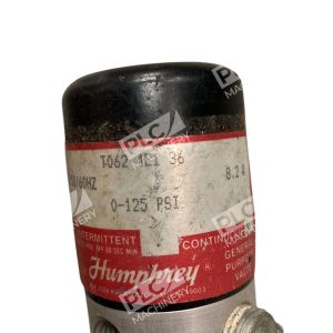 This Humphrey solenoid valve has a coil voltage of 120V-AC and a pressure range of 0-125 PSI. The model number is T062-4E1-36, with a power rating of 8.2W.