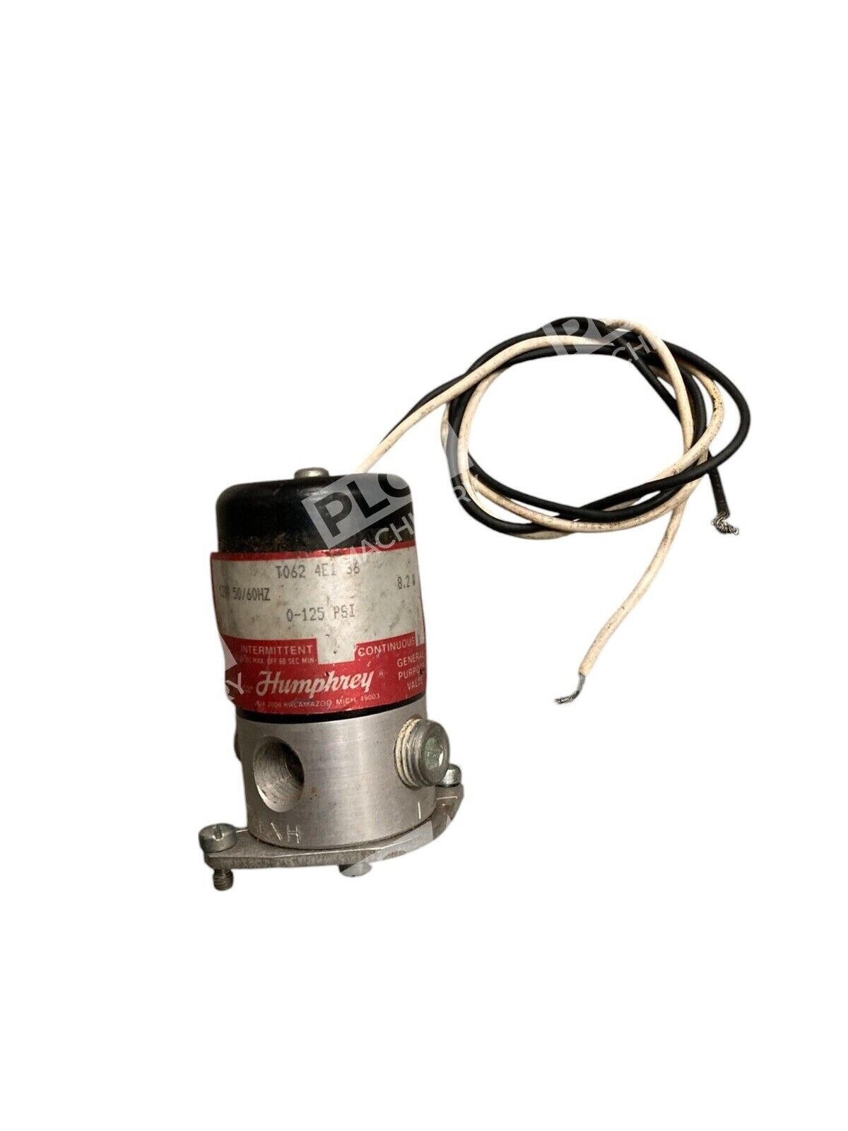 This Humphrey solenoid valve has a coil voltage of 120V-AC and a pressure range of 0-125 PSI. The model number is T062-4E1-36, with a power rating of 8.2W.