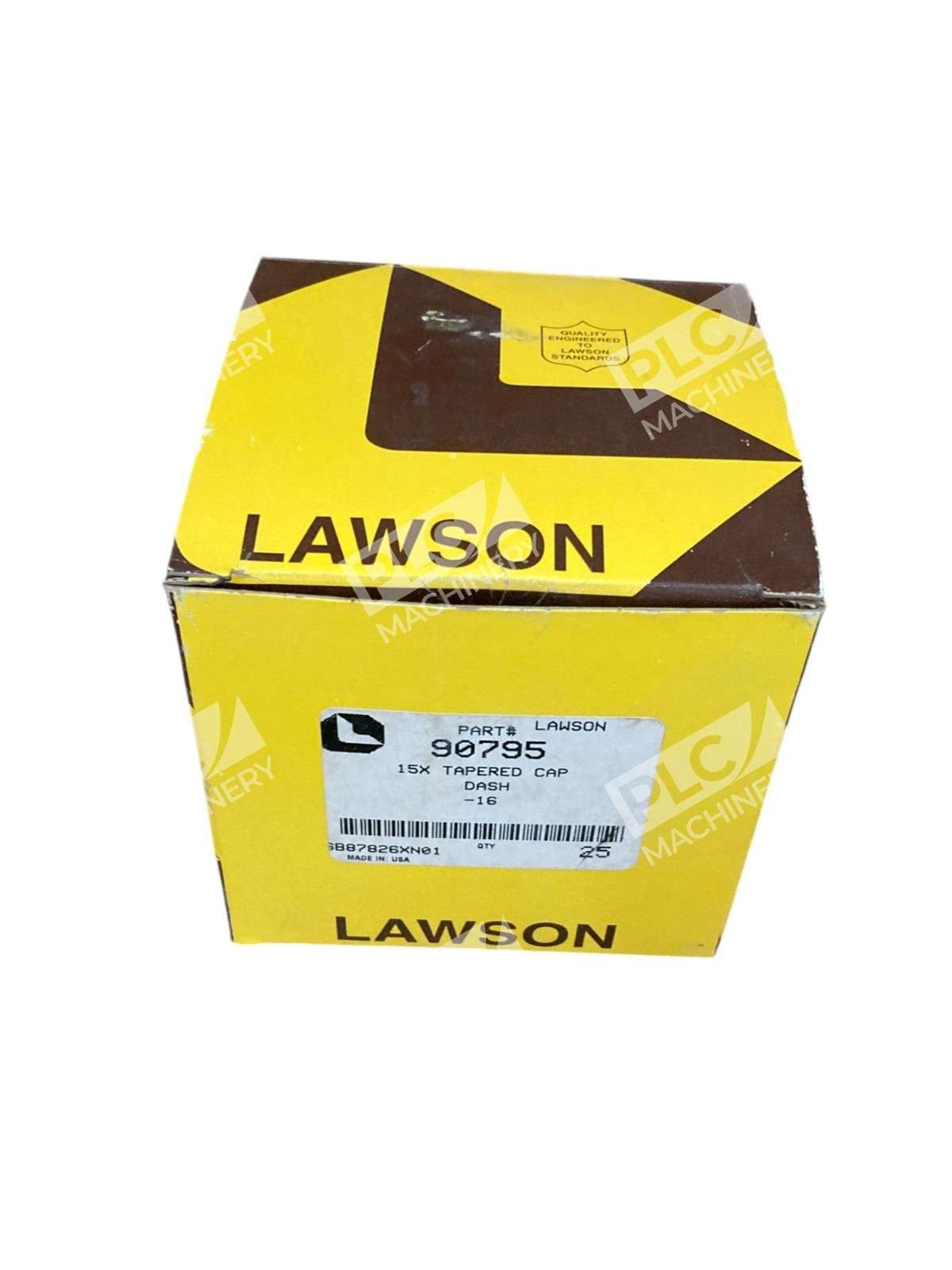 The Lawson 15X Tapered Cap Dash -16 90795 is a product manufactured by PMI in the United States. This box of 25 units features a model number of T1063 and is designed for business and industrial use. With a tapered cap for easy dispensing, this product is a reliable addition for various industrial applications.