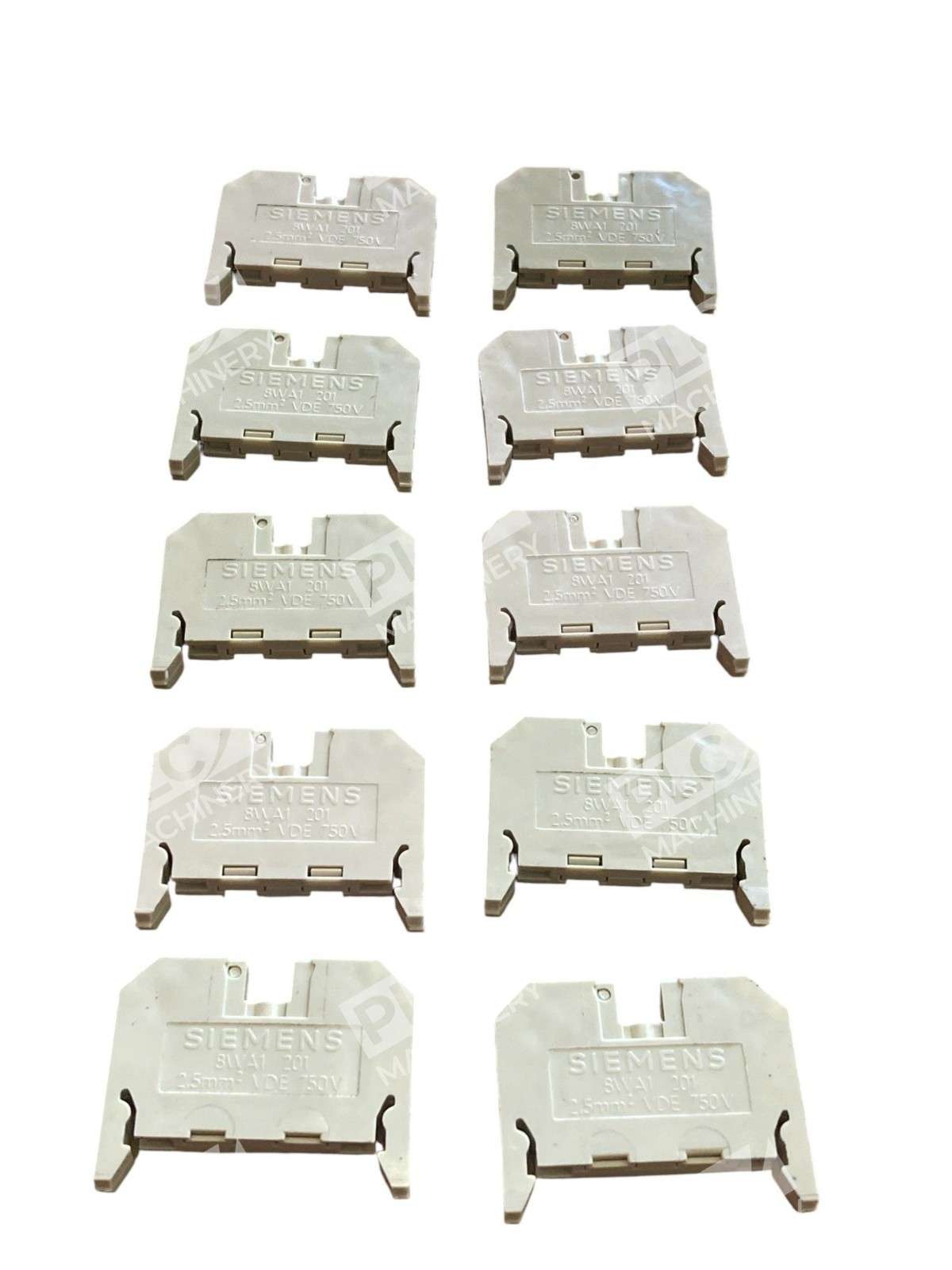 The product is a lot of 10 Siemens 8WA1 201 Terminal Blocks. These terminal blocks are designed for connecting wires securely and are made of durable plastic material. They are suitable for wire gauges ranging from 1-5 AWG and are manufactured in Germany by Siemens. The feed-through termination type allows for easy and reliable connecting of wires, making it ideal for electrical equipment and industrial applications.