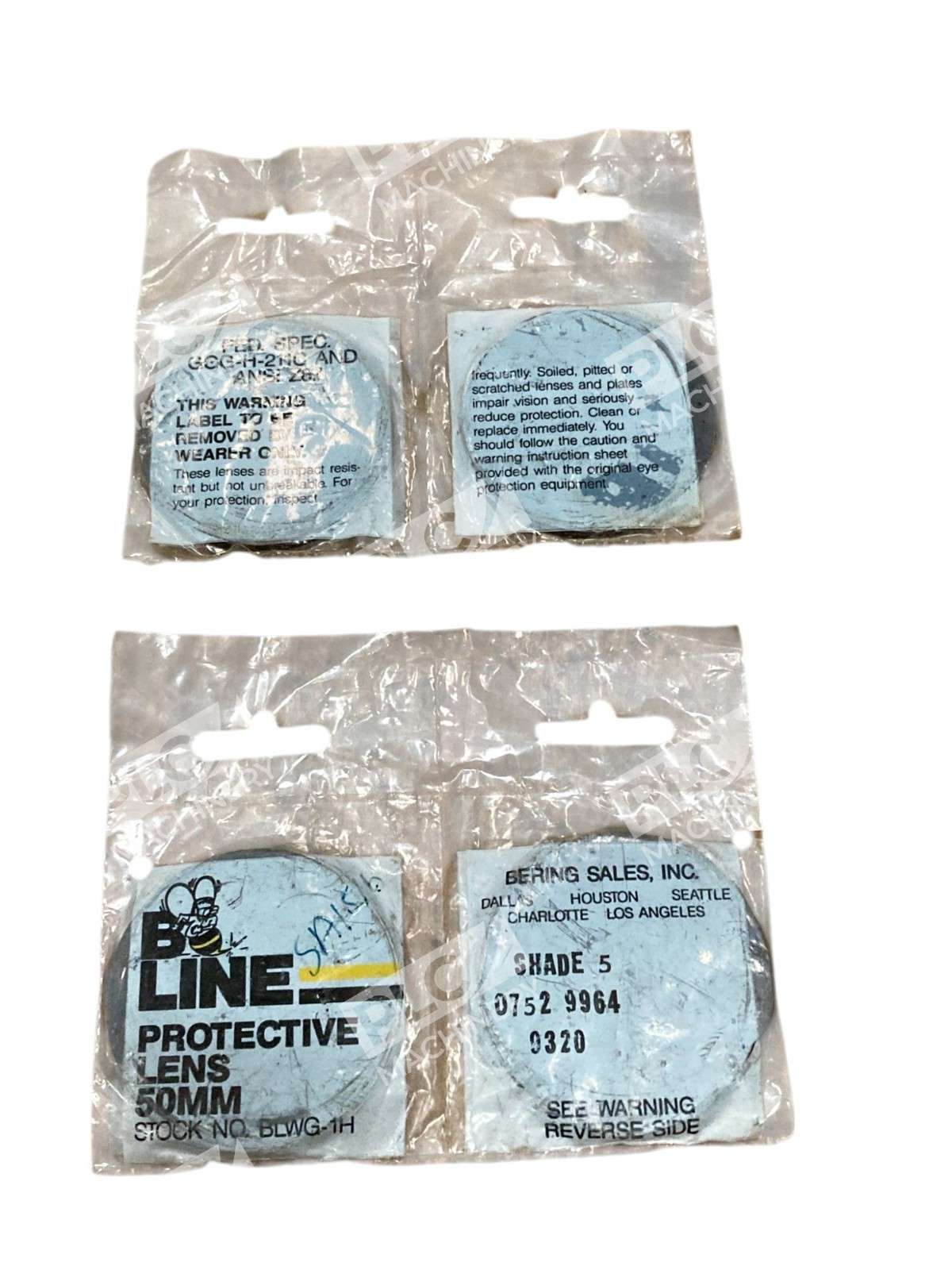 The product is a lot of four B-Line BLWG-1H protective lenses with a 50mm shade of 5. These lenses are designed to provide protection for welders while working with welding equipment. They are specifically made for use in CNC, metalworking, and manufacturing settings, offering a high level of protection against radiation and sparks. Ideal for industrial settings, these protective lenses are essential for ensuring the safety and well-being of welders and other workers in the manufacturing process.