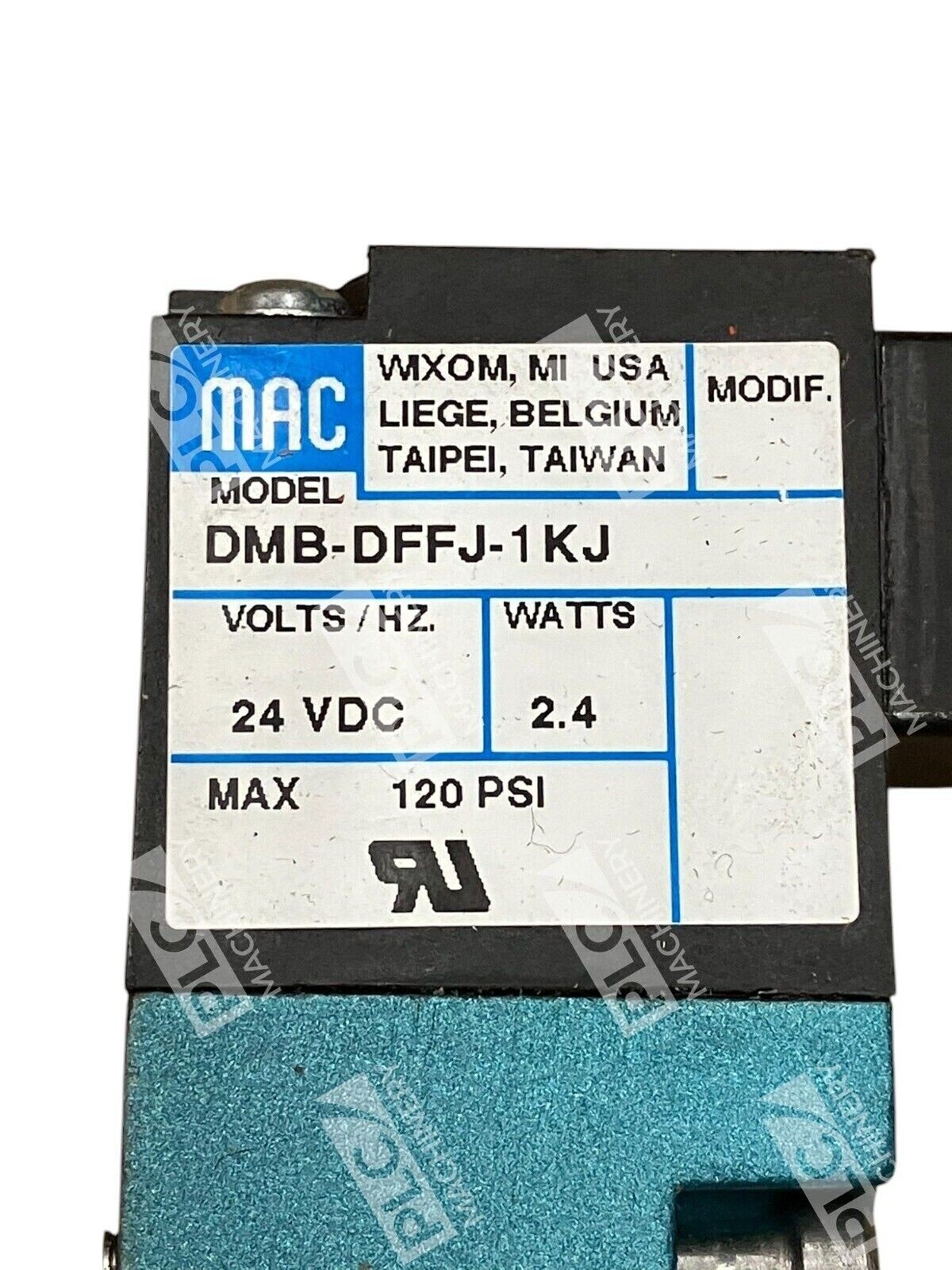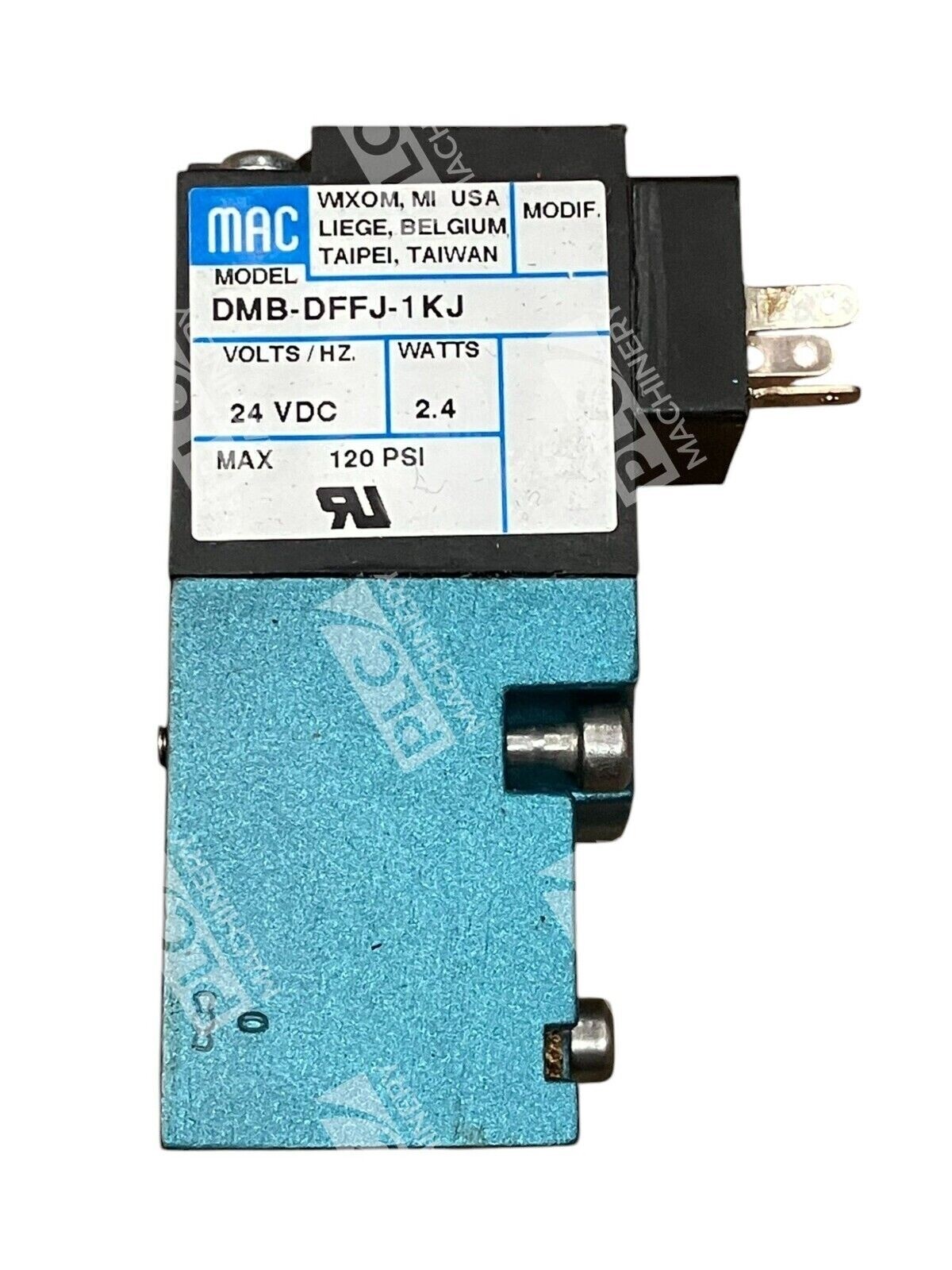 The product is a MAC 2.4W 24VDC Solenoid Valve with the model number DMB-DFFJ-1KJ. It is a single unit designed for industrial applications in areas such as mechanical power transmission and industrial automation.
