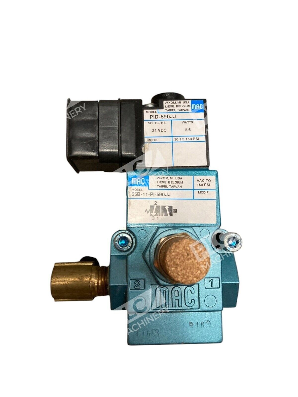 The product is a MAC 55B-11-PI-590JJ Solenoid Valve with a 24VDC voltage and 2.5W power rating. It is designed for pneumatic applications and is manufactured by MAC Valves. The valve operates through a solenoid mechanism, providing precise control over the flow of air or gas in a system.