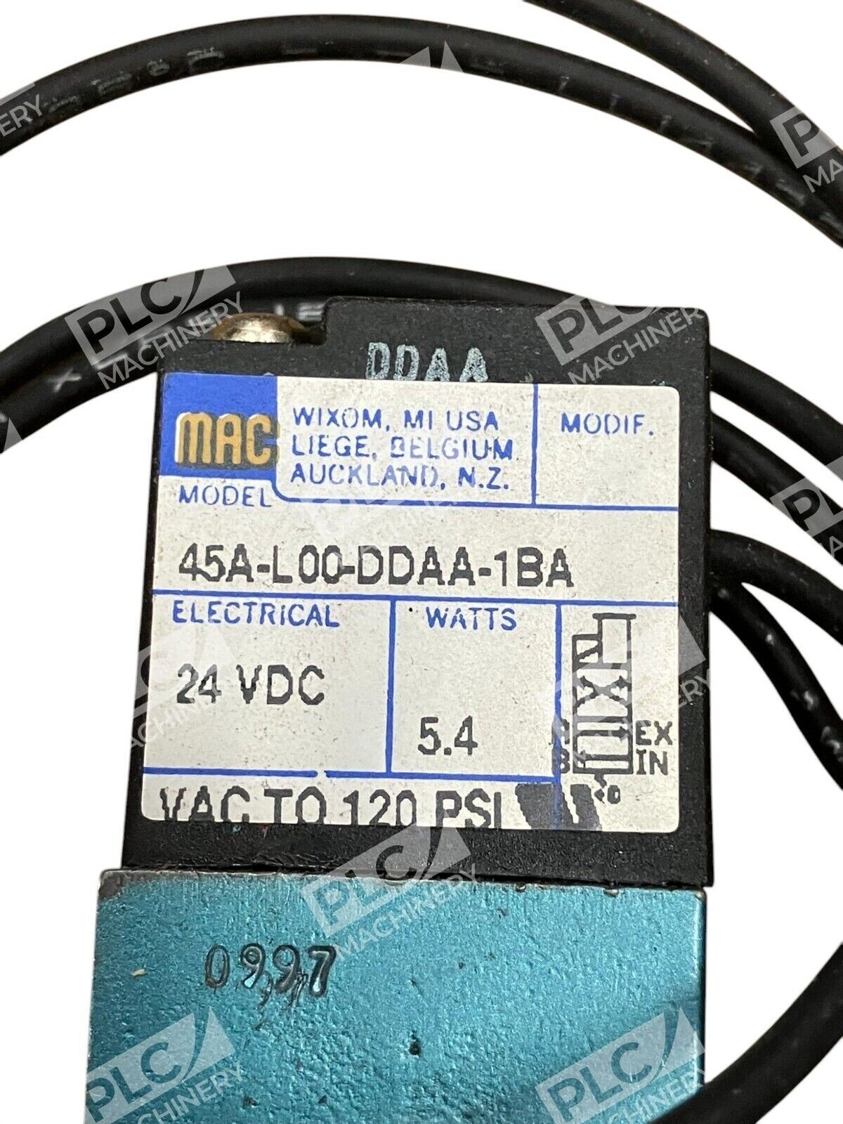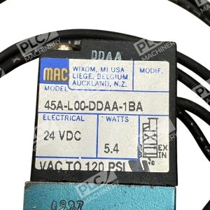 The product is a brand new MAC Valves Inc valve model 45A-L00-DDAA-1BA (45AL00DDAA1BA). It belongs to the Brand category of MAC Valves Inc and is likely a component used in hydraulics, pneumatics, pumps, and plumbing systems.