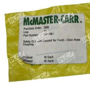 The McMaster-Carr 5344K81 Safety Clip with Lanyard is a set of 10 units designed for twist-claw hose couplings. This product ensures safety by securely attaching a lanyard to the coupling, preventing accidental disconnection and potential injury. The brand McMaster-Carr is known for its high-quality industrial fittings and adapters, making this safety clip a reliable choice for various hydraulic, pneumatic, pump, and plumbing applications. It is an essential accessory for businesses and industries requiring secure and dependable connections.