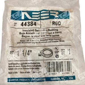The Neer RGD 1-1/4″ Insulated Grounding Bushing, model number 44384, is designed to provide a smooth, well-rounded bearing surface at the end of rigid conduits, IMC, and other threaded connectors. This ensures the protection of wires or cables during installation and operation.