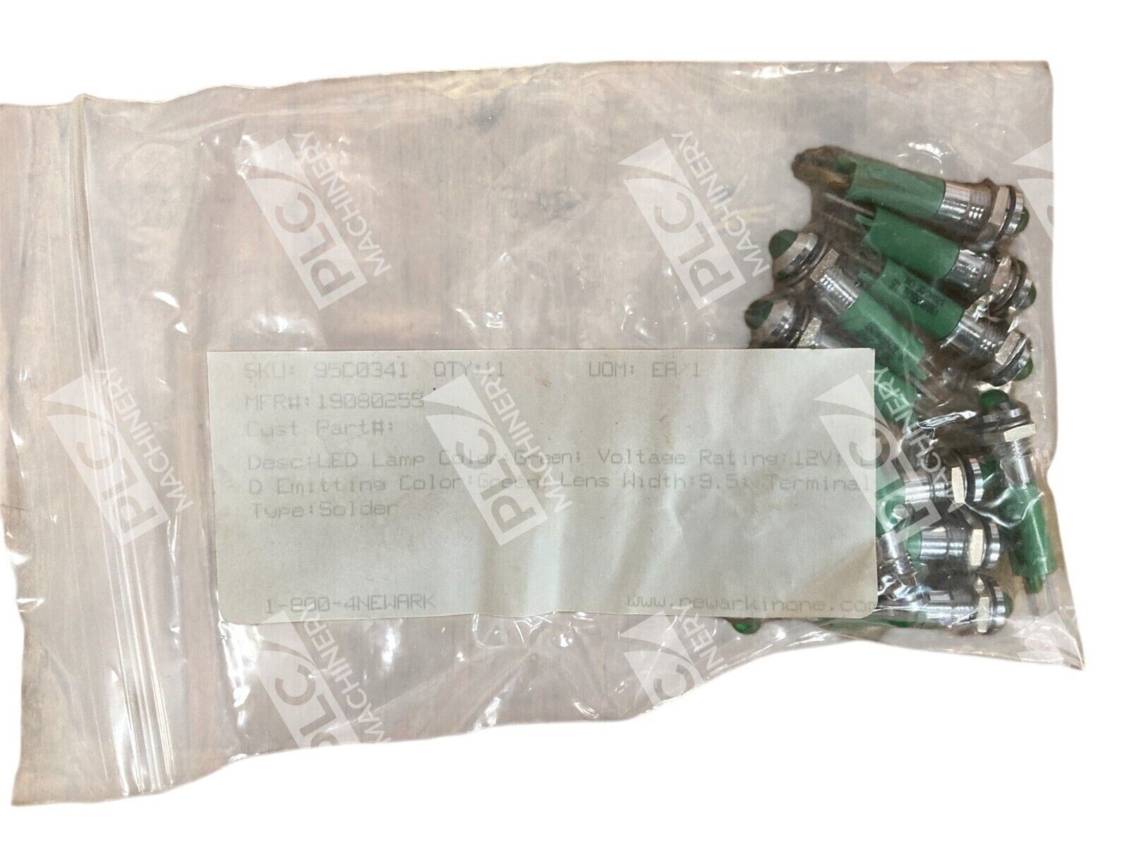 The product is a Newark 19080255 LED Lamp in Green color, designed to operate at 12V. The product’s part number is 95C0341.