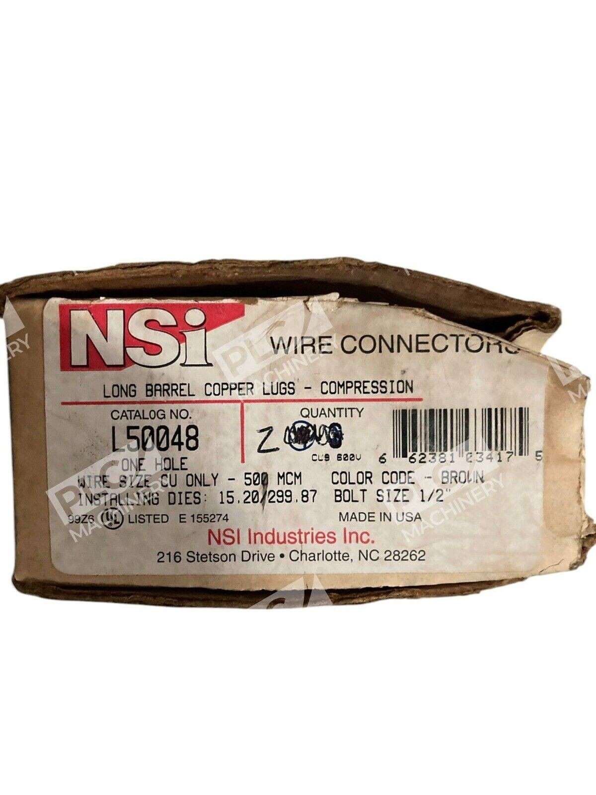 NSI Industries 1/2″ Long Barrel Copper Lugs Wire Connector L50048 is a box of 2 compression termination connectors designed for use with 500 MCM wire. They are suitable for wire mounting and are branded by NSI.