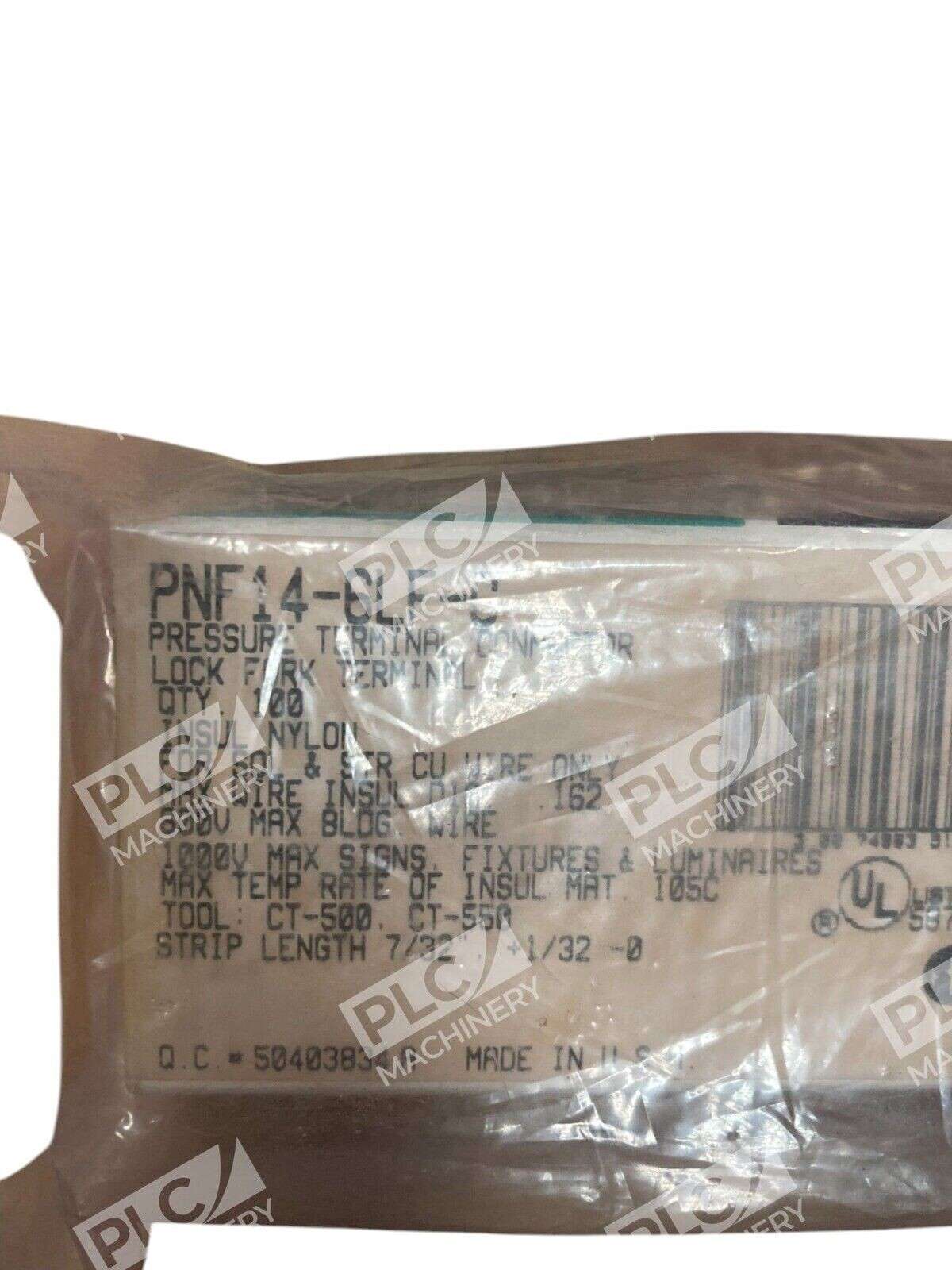 Panduit Pressure Terminal Connector Lock Fork Terminal PNF14-6LF-C is a cable clamp with a 2-pin connector style for wire mounting. It has a length of 3.6 inches, a width of 1.9 inches, and is designed for 16-14 AWG wires. The package includes 100 units of these nylon terminals suitable for No. 8 connectors.