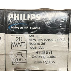 This is a Philips MR16 20W 12V light bulb with the model number 20MR16/FL36 and part number 814051. It is designed for facility lighting in business and industrial settings. The brand of the light bulb is Philips.